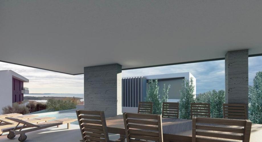 Na prodaju je luksuzni stan s privatnim bazenom, smješten na drugom katu moderne novogradnje u Novalji. Nalazi se na atraktivnoj lokaciji, udaljenoj svega 7-10 minuta hoda od mora i centra grada. Ova lokacija osigurava privatnost i mir, a stan nudi prekrasan pogled na more s terase i iz cijelog stana
