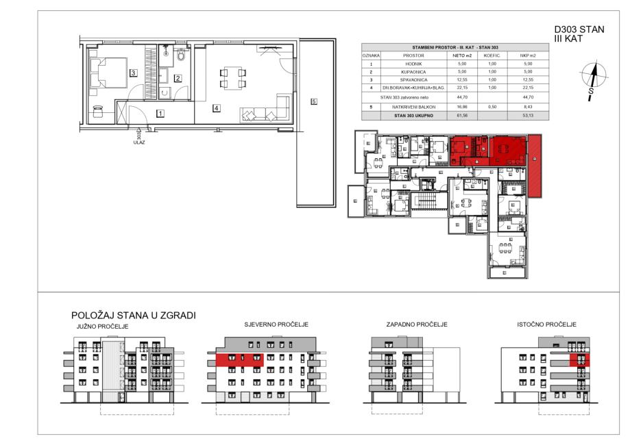 U ponudi je stan D303, smješten na 3. katu dvorišne zgrade. Sa natkrivenim balkonom od 16,86 m², stan čini ukupno 61,56 m² površine, od čega 53,13 m² neto korisne površine stana. Savršen odabir za one koji traže spoj privatnosti, funkcionalnosti i elegancije. Tlocrt, detaljni prikaz i obračun površina dostupni su u slikama oglasa.