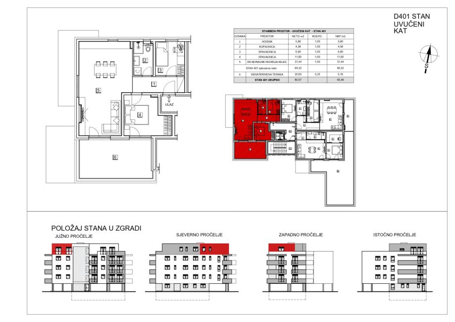 U ponudi je stan D401, smješten na uvučenom katu dvorišne zgrade. Sa nenatkrivenom terasom od 20,65 m², stan čini ukupno 80,97 m² površine, od čega 65,48 m² neto korisne površine stana. Savršen odabir za one koji traže spoj privatnosti, funkcionalnosti i elegancije. Tlocrt, detaljni prikaz i obračun površina dostupni su u slikama oglasa.