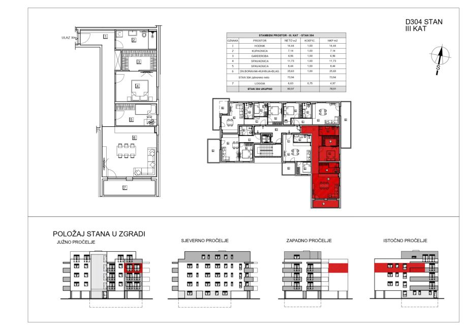 U ponudi je stan D304, smješten na 3. katu dvorišne zgrade. Sa loggiom od 6,63 m², stan čini ukupno 80,57 m² površine, od čega 78,91 m² neto korisne površine stana. Savršen odabir za one koji traže spoj privatnosti, funkcionalnosti i elegancije. Tlocrt, detaljni prikaz i obračun površina dostupni su u slikama oglasa.