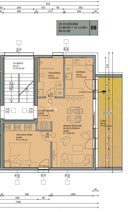 U ponudi je trosobni stan ukupne neto površine 53,88 m²+ lođa 14,14 m² funkcionalnog rasporeda, idealan za obitelj. Stan se sastoji od prostranog dnevnog boravka s blagovaonicom (18,86 m²), kuhinje (7,52 m²), jedne spavaće sobe (13,15 m²), kupaonice (6,42 m²), ulaznog hodnika (7,93 m²) i lođa (14,14 m²) - po tlocrtu stan broj 09. Stanu pripada i spremište od 5,15m2. Moguća kupnja garaže za 30.000 eura.