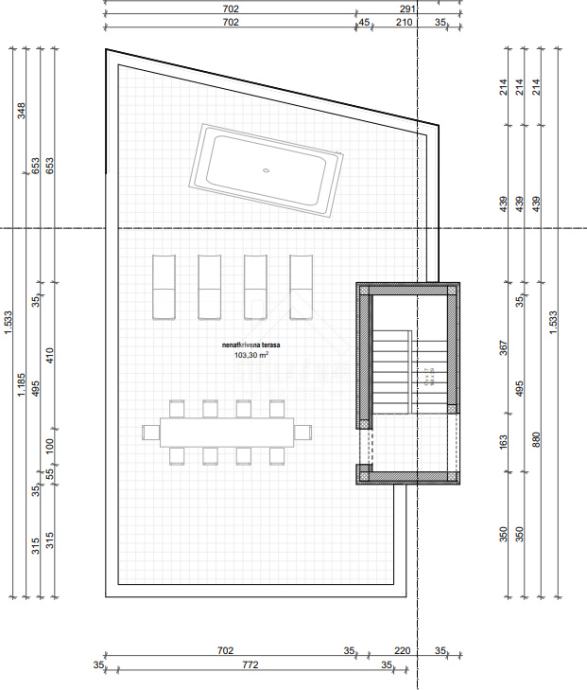 Stan se sastoji od kuhinje i blagovaonice te dnevnog boravka otvorenog tipa sa kojih se izlazi na komfornu natkrivenu terasu, spremišta, kupaonice i dvije spavaće sobe od kojih jedna ima vlastitu kupaonicu. Pripada mu krovna terasa i 2 parkirna mjesta. Raspored i površinu stana moguće je pogledati na tlocrtu u galeriji fotografija nekretnine.