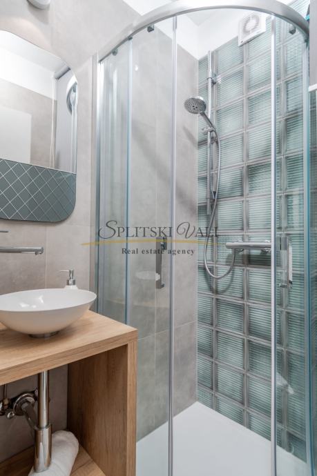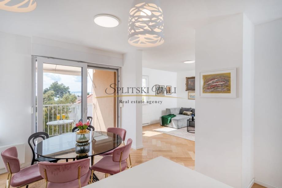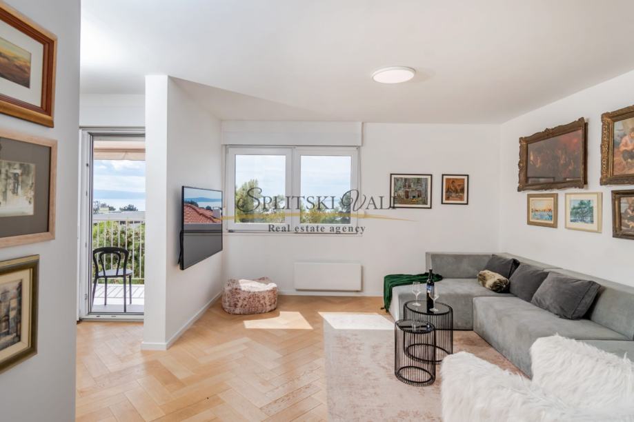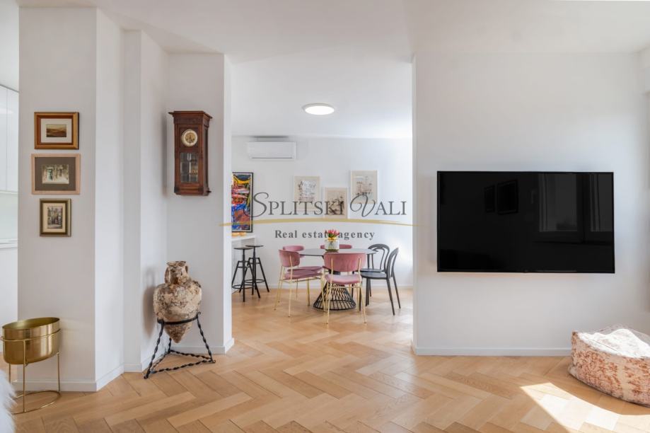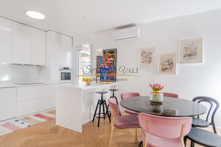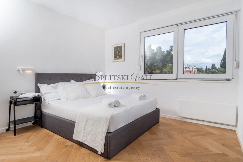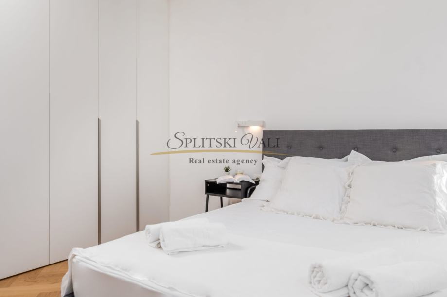 Posredujemo u najmu luksuznog dvosobnog stana na odličnoj lokaciji u Splitu - predio Meje. Osim dvije spavaće sobe, stan se sastoji od kuhinje s blagovaonicom, dnevne sobe, kupatila, hodnika i balkona s prekrasnim panoramskim pogledom na more. Stan je južne orijentacije te je iznimno svijetao i osunčan.