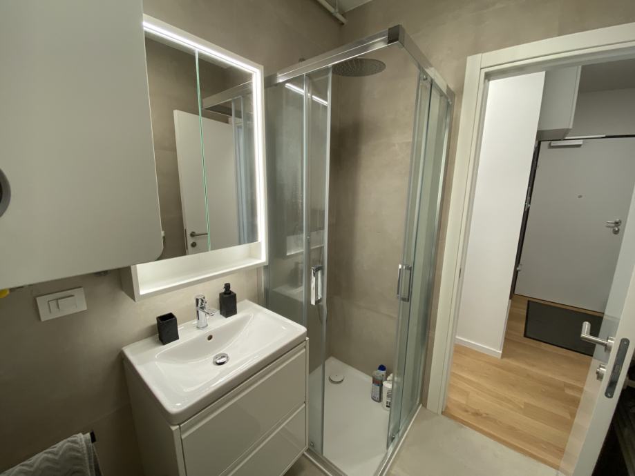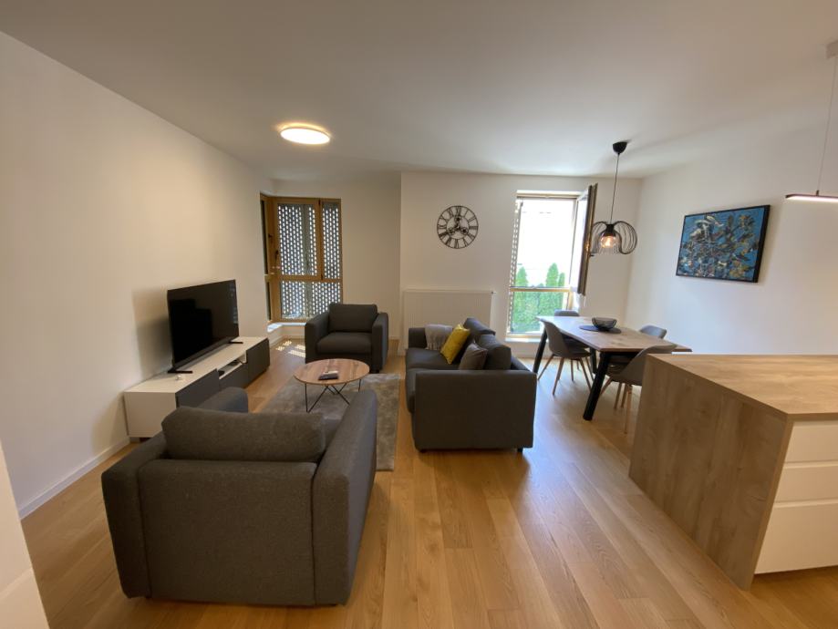 Beautiful apartment in a new building situated in a small and quiet street that is close to Petrova street and Kvaternik square and only a few minutes away by foot from the tram station. It is in the vicinity of all important amenties (school, kindergarden, restaurants, shops, market, university..). It is completely newly furnished. It has app. 80 m2 and it is on the 2nd floor and has a wonderful loggia! It consists of beautiful living room with kitchen and dining area,2 bathrooms and 2 bedrooms! The apartment also has a parking place in the garage of the building.