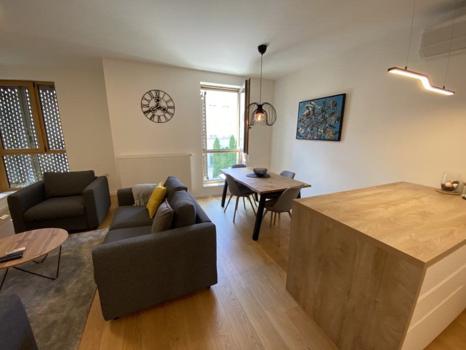 Predivan stan u novogradnji u maloj, mirnoj ulici u blizini Petrove ulice i Kvatrića, na par minuta hoda od tramvajske stanice, u blizini svih bitnih sadržaja (škola, vrtić, restorani,tržnica, dućani, fakultet..)Kompletno luksuzno namješten. Nalazi se na 2. katu zgrade sa predivnom lođom. Stan ima cca 80 m2 i sastoji se od predivnog dnevnog boravka s kuhinjom i blagavaonom, 2 kupaone i dvije spavaće sobe!