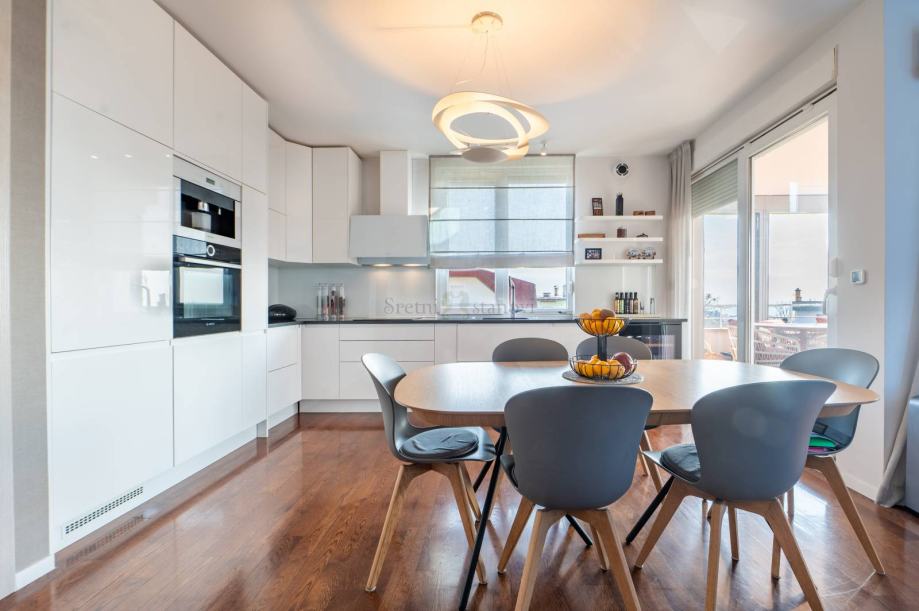 Stan ima 125 m2 i prostire se preko cijele pretposljednje etaže novije zgrade sa 4 stambene jedinice. Stan se sastoji od 3 spavaće sobe, prostranog dnevnog boravka sa velikom staklenom stijenom koja omogućuje puno svjetlosti i open-concept kuhinjom, kupaonice, vešeraja sa perilicom i sušilicom, 1 terase i 2 balkona.