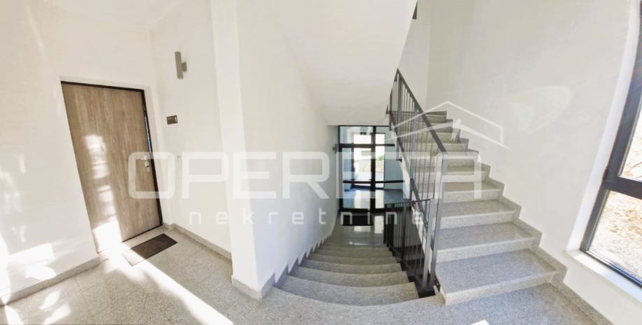 Unutrašnjost stana prostire se u prizemlju istočnog dijela zgrade i pomno je osmišljena za udoban i luksuzan boravak. Prostor se sastoji od hodnika, praonice, moderne kuhinje povezanom s blagovaonicom i dnevnim boravkom, dvije elegantne spavaće sobe s vlastitim kupaonicama, te natkrivenog balkona koji pruža idealno mjesto za opuštanje uz pogled na more.