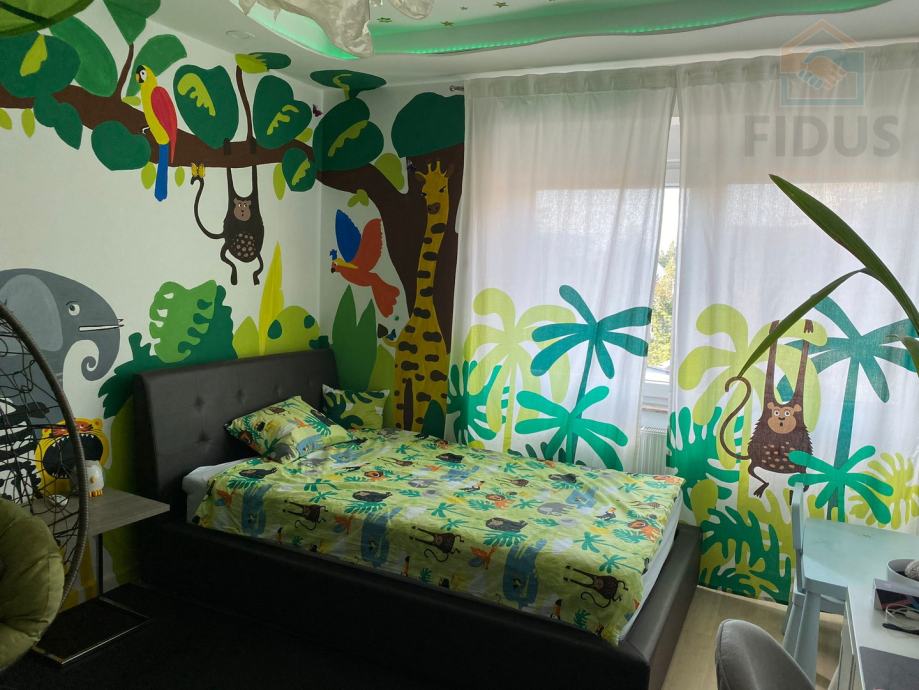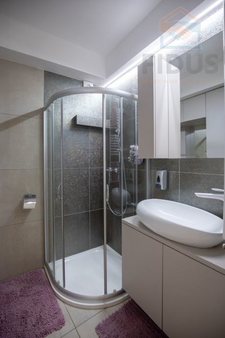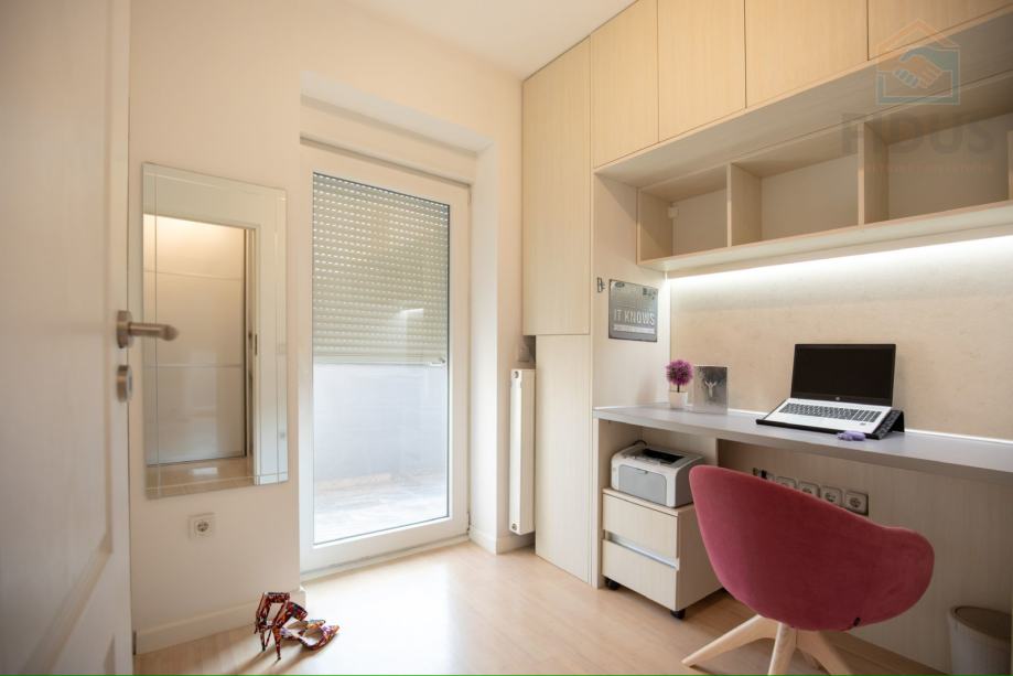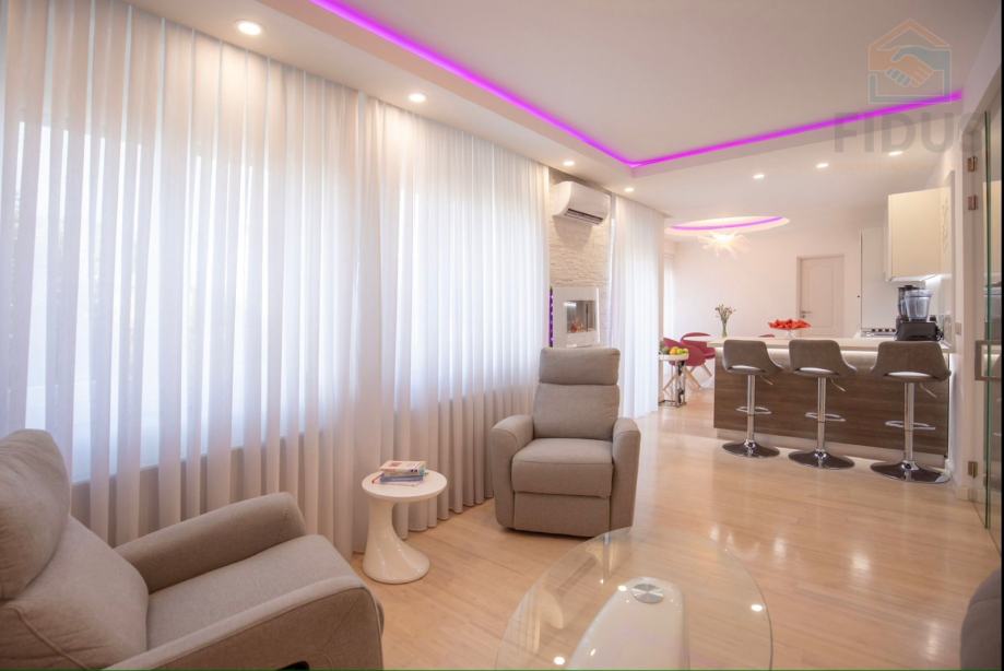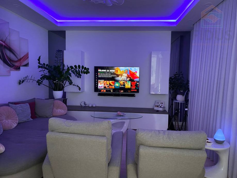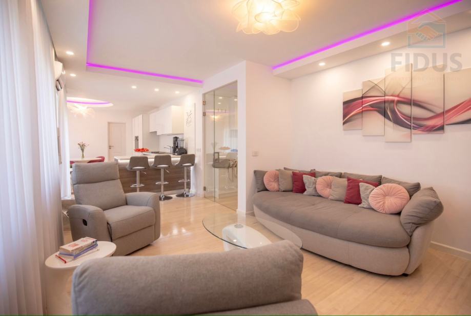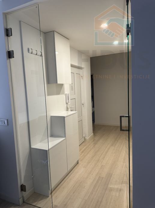 Stan se prodaje namješten sa svim uređajima i namještajem po mjeri - ugradbeni ormari s LED rasvjetom, kuhinja, kreveti, kupaonski namještaj, skladišni prostor u ostavi, blagovaonski stol sa stolicama i klupicom, kutna garnitura, nekoliko TV-a, ugradbeni kućanski aparati (pećnica, štednjak, hladnjak, mikrovalna, perilica posuđa, perilica rublja sa sušilicom, cafe aparat, itd).