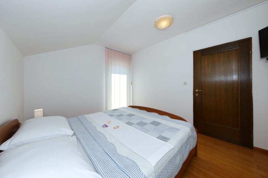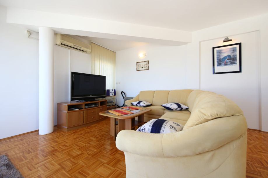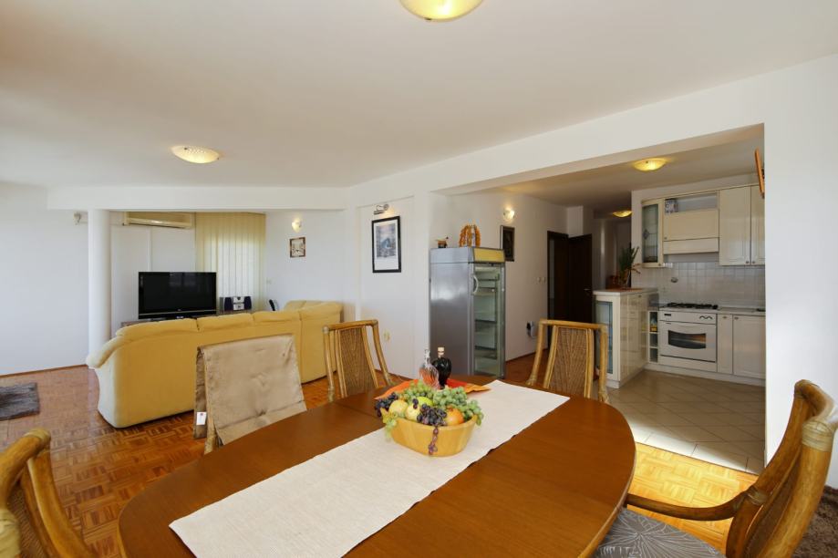 Sastoji se od ulaznog hodnika, kuhinje i blagovaonice sa dnevnim boravkom (open space) površine oko 70 m2, četiri spavaće sobe, dvije kupaonice (jedna sa hidromasažnom kadom), ostava 3 m2, drvarnica u prizemlju 18 m2. Stan je u funkciji turizma, potpuno namješten (tako se i prodaje): kuhinja po mjeri, blagovaonica od ratana (stol, stolice za 6 osoba), kutna garnitura brušena koža, ugrađena vitrina, boxing kreveti, vrhunska keramika...