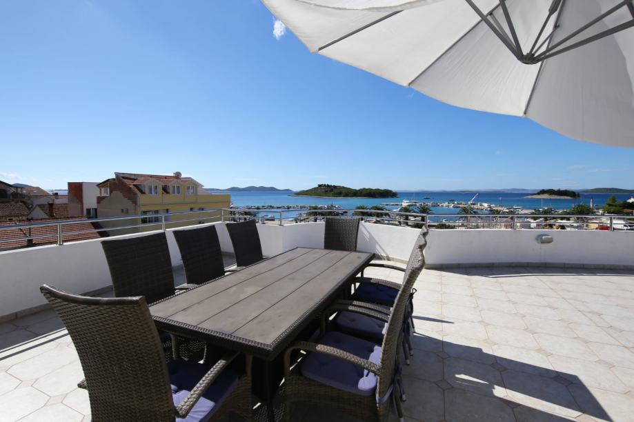 Uokolo cijelog stana je terasa koja na proširenom dijelu (koji izgleda kao pramac broda) ima oko 50 m2. Na terasi je vanjski dnevni boravak sa garniturom od ratana (za 8 ljudi), sjedeća garnitura (trosjed i dvije fotelje, klub stol) jacuzzi, plinski roštilj, tenda...