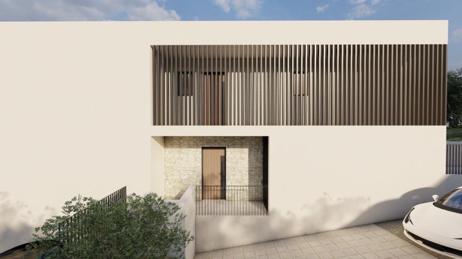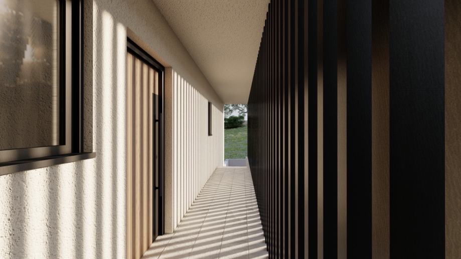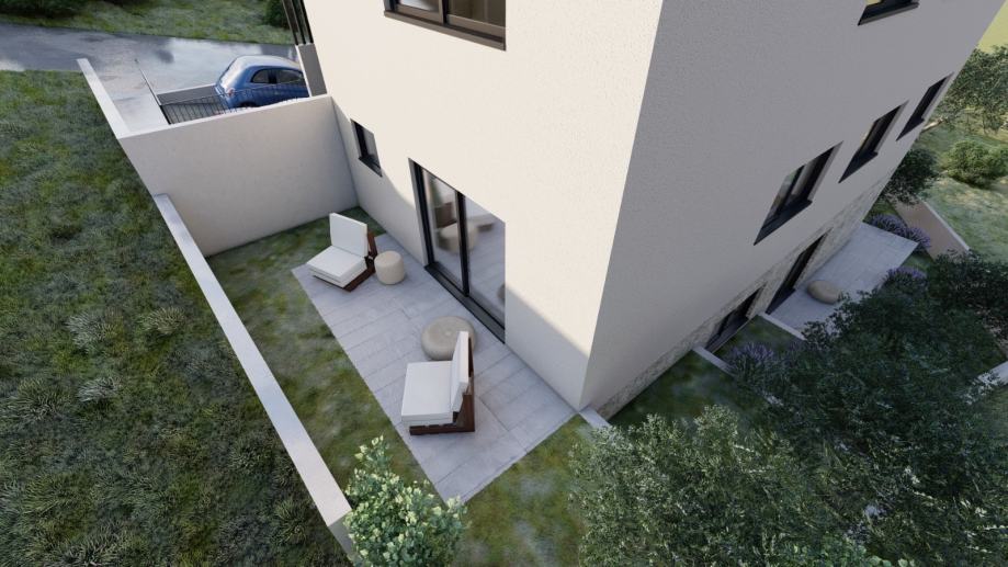 • vanjski dio prizemnog stana obložen prirodnim bijelim kamenom, što dodatno naglašava luksuz i estetiku