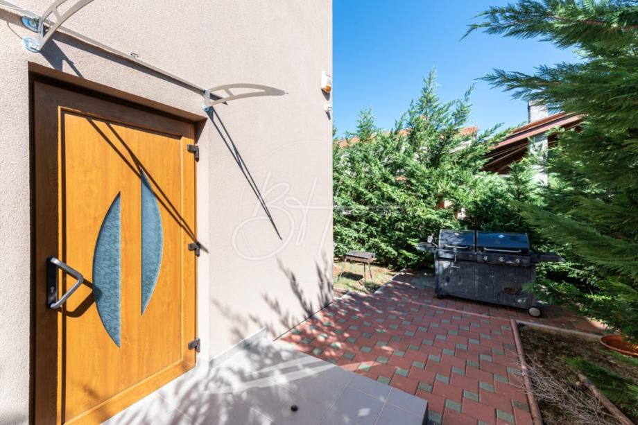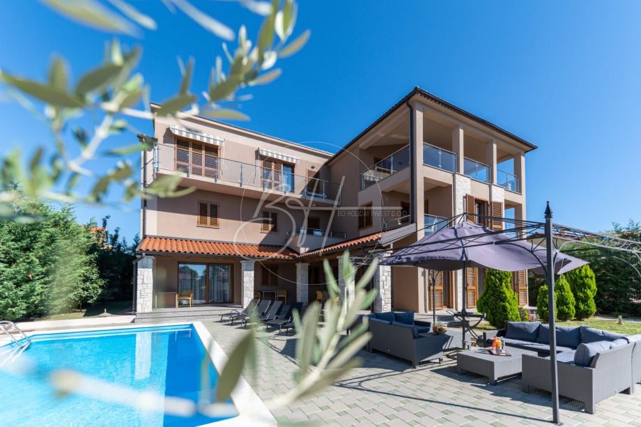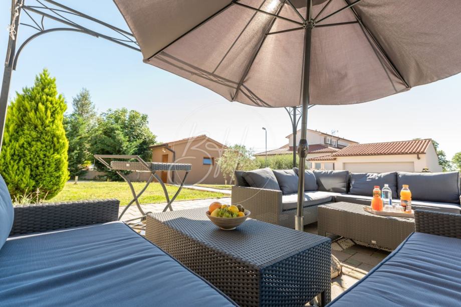 Iz dnevnog boravka izlazi se na prekrasnu terasu s bazenom površine 38 m², savršenim za opuštanje i uživanje u privatnosti vlastitog dvorišta.
