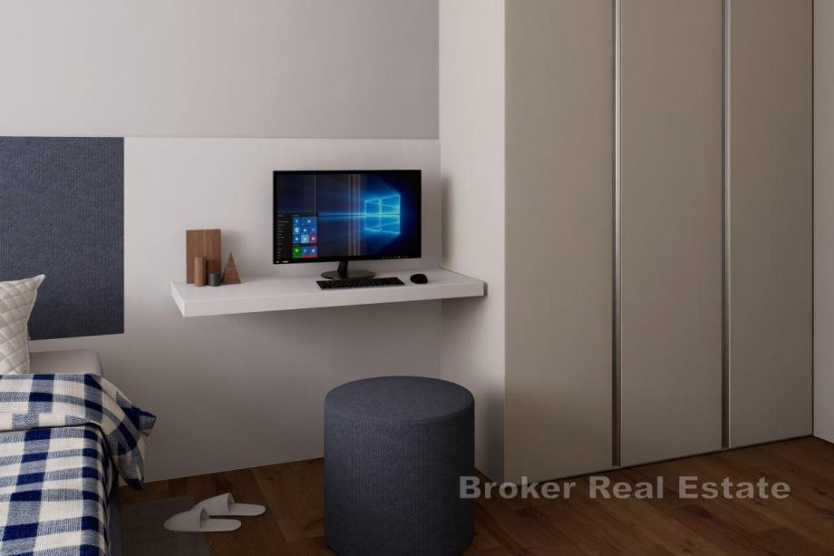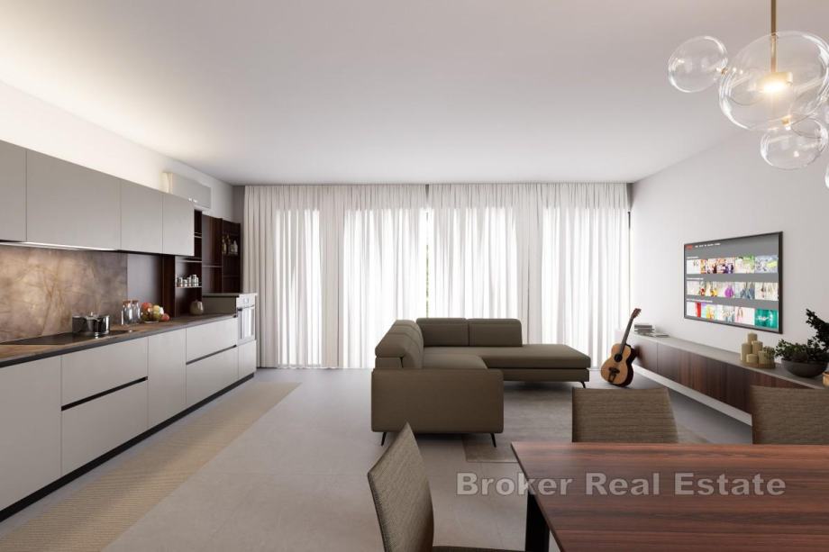Posebna prednost ovog stana je natkrivena terasa od 23 m² koja se nadovezuje na privatni vrt od 186 m² uz mjesto za privatni bazen, lounge zonu ili obiteljska okupljanja s pogledom na more.