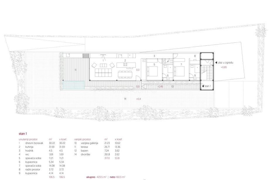 Posredujemo u prodaji vrhunskog, visoko luksuznog i vrlo prostranog dvosobnog stana u novogradnji na jednoj od najljepših i najmirnijih lokacija južne strane otoka Korčule. Riječ je o manjoj urbanoj vili koja će imati samo tri stana, a ovaj stan je smješten na najdonjoj etaži. Neto površinamu je 160m2, a sastoji se od hodnika, dvije spavaće sobe (svaka s vlastitom kupaonicom, a jedna i radnim kutkom), toaleta, kuhinje i iznimnog dnevnog boravka. Vanjski prostor stana koji se otvara iz dnevnog dijela uključuje vanjsku galeriju, terasu, dvorište i bazen. Zgrada se gradi inovativnim, održivim i ekološki prihvatljivim načinom (CLT sustav), dok će finalna oprema stana uključivati smart home sustav, smart glass film za staklene stijene, sustav s dizalicom topline renomiranog proizvođača, podno grijanje, vrhunsku keramiku i sanitarije. Lokacija ove novogradnje koja je tik do mora jamči nevjerojatan mir, privatnost i pogled na more, a impresivan vanjski prostor svakog stana omogućava osjećaj tradicionalnog života na otvorenom. Završetak je planiran za jesen 2024. Vlasništvo uredno.