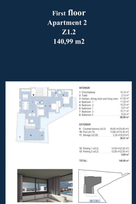 Stan se sastoji od ulaznog hodnika, prostranog dnevnog boravka s kuhinjom i blagovaonicom, WC-a, kupaonice, dvije spavaće sobe te glavne spavaće sobe s privatnom kupaonicom. Iz dnevnog boravka i spavaćih soba izlazi se na prostranu, djelomično natkrivenu terasu, koja vodi do privatnog bazena površine 13,86 m2 i odvojenog lounge prostora idealnog za obiteljska okupljanja. Unutarnja površina stana iznosi 99,98 m2, dok vanjski prostor, uključujući terasu, lounge, vrt i bazen, iznosi 65,76 m2. Dodatno, stan posjeduje dva parkirna mjesta ukupne površine 25 m2. Ukupna površina stana, uključujući sve navedene prostore, iznosi 140,99m2