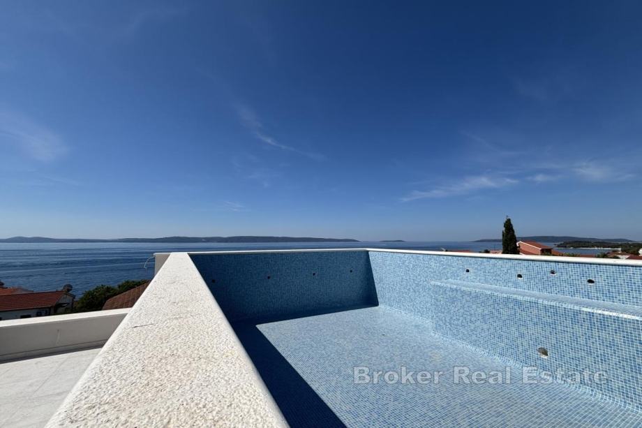Novoizgrađeni luksuzni penthouse u Okrugu Gornjem, s prekrasnim pogledom na more i prostranom krovnom terasom na kojoj je smješten vlastiti bazen, idealan za uživanje tijekom toplih ljetnih dana. Stan se nalazi na drugom katu manje, moderno dizajnirane stambene zgrade opremljene dizalom, a okružen je novoizgrađenim suvremenim objektima koji stvaraju mirno i ugodno susjedstvo.