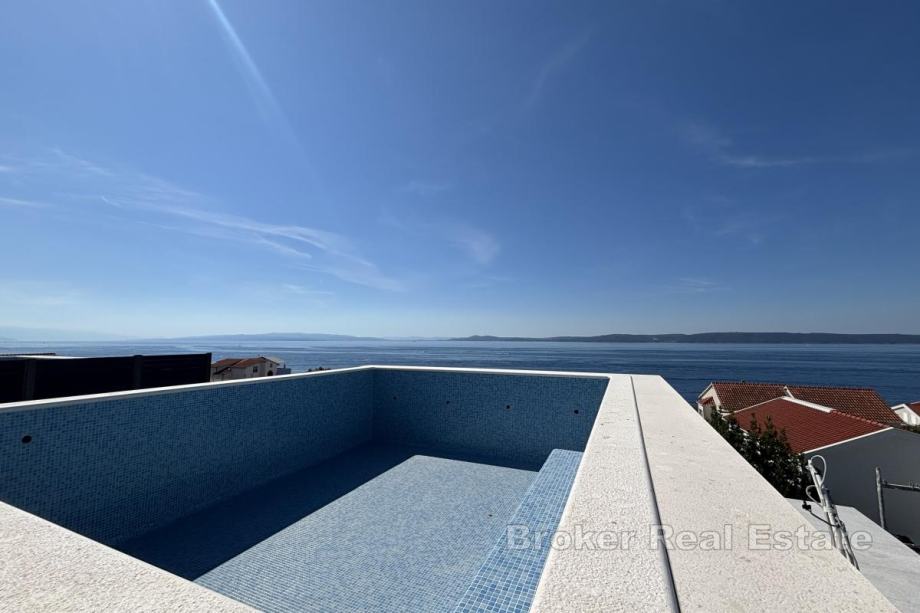 Stan ima ukupnu površinu od 73,50 m² i sastoji se od funkcionalnog hodnika, prostranog dnevnog dijela u kojem se nalaze moderno koncipirana kuhinja, blagovaonica i dnevni boravak otvorenog tipa, dvije udobne spavaće sobe te dvije elegantno uređene kupaonice. Vanjski dio stana uključuje natkriveni i nenatkriveni balkon, dok se posebna vrijednost nekretnine ogleda u nenatkrivenoj krovnoj terasi iznad stana, koja je opremljena vlastitim bazenom i nudi očaravajući panoramski pogled na more i okolinu. Ukupna površina ovog vanjskog dijela iznosi 91,60 m², što omogućava maksimalan komfor i privatnost.