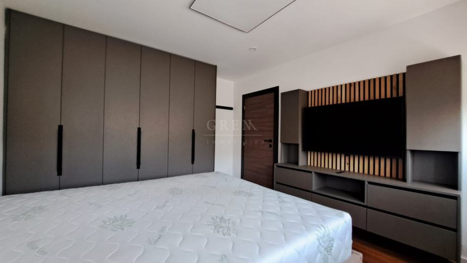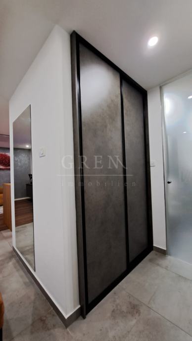 U dnevnom boravku nalaze se fotelje Natuzzi ( okretanje - struja ), TV 65 inch-a Samsung Neo QLED 9 generacije, te također isti TV samo manji 50 inch-a u spavaćoj sobi. Mala spavaća soba je pregrađena kaljenim staklom koje je pomično i odvaja je od dnevnog boravka. U centralnom dijelu je ugrađena klimatizacija dizajnera Haori Toshiba snage 4,6 KW, kao i u drugoj spavačoj sobi od 3,5 KW, što je i više nego dovoljno za ovaj stan!!