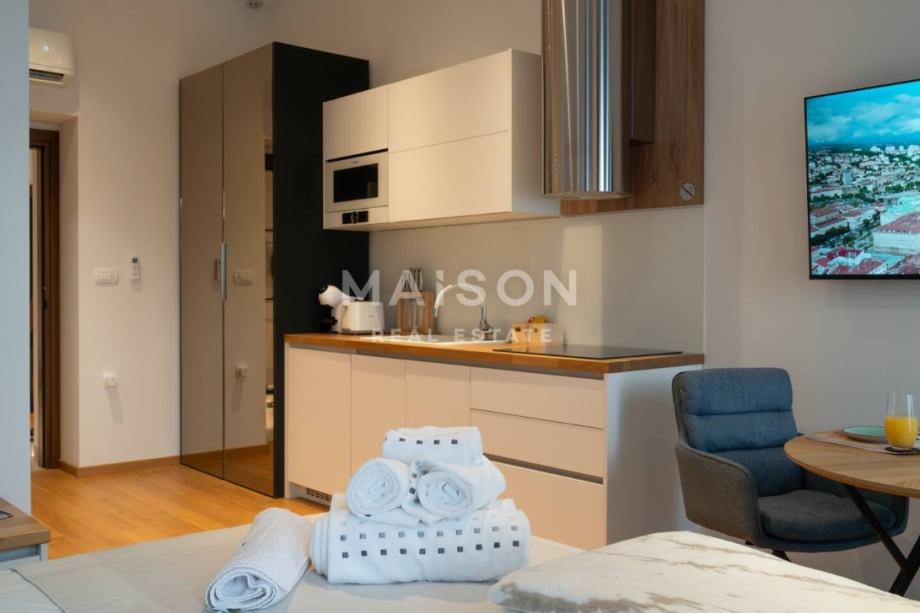 Već pri prvom koraku, studio osvaja svojim dizajnom koji neodoljivo podsjeća na luksuznu hotelsku sobu. Pažljivo osmišljeni interijer pruža maksimalnu iskoristivost prostora, zračeći pritom toplinom i sofisticiranošću.