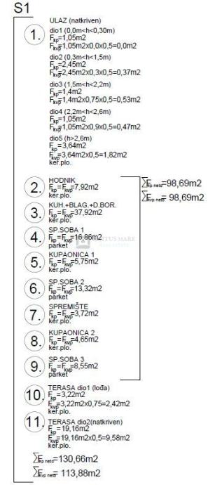 Stan S1 se nalazi u visokom prizemlju zgrade i sastoji se od: ulaznog prostora, tri spavaće sobe, prostranog dnevnog boravka, kuhinje s blagovaonicom, hodnika, dvije kupaonice te prostrane terase s koje se pruža panoramski pogled na more. Uz to, apartman dolazi s vlastitom garažom smještenom u prizemlju zgrade.