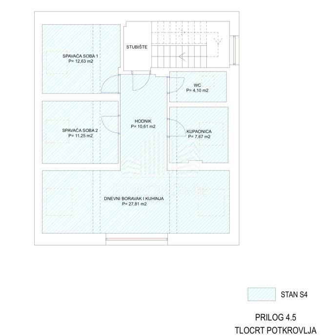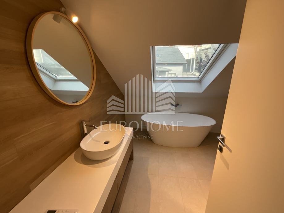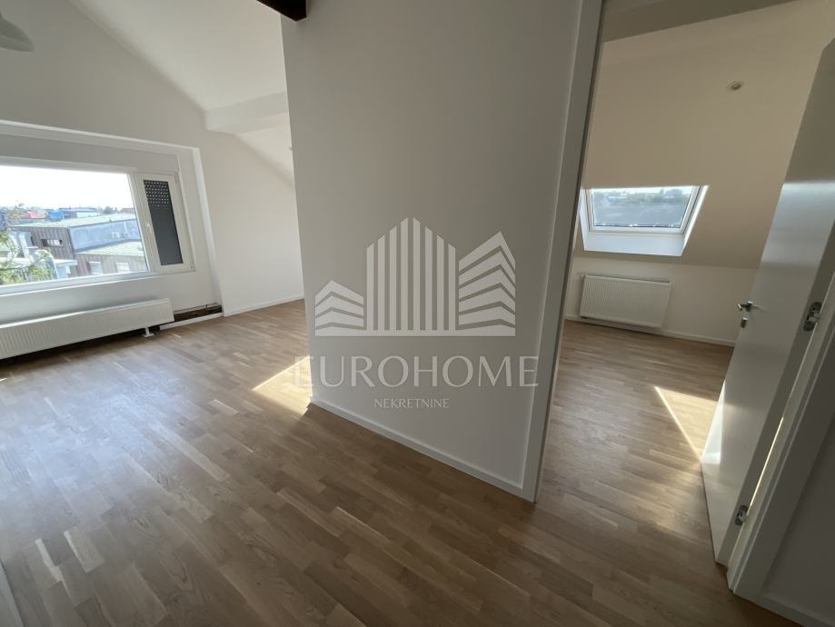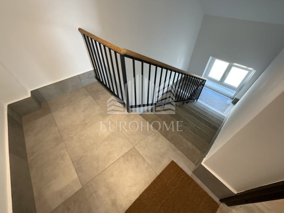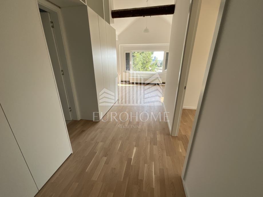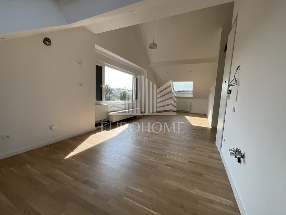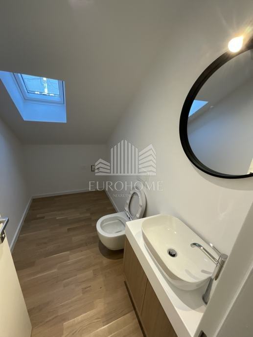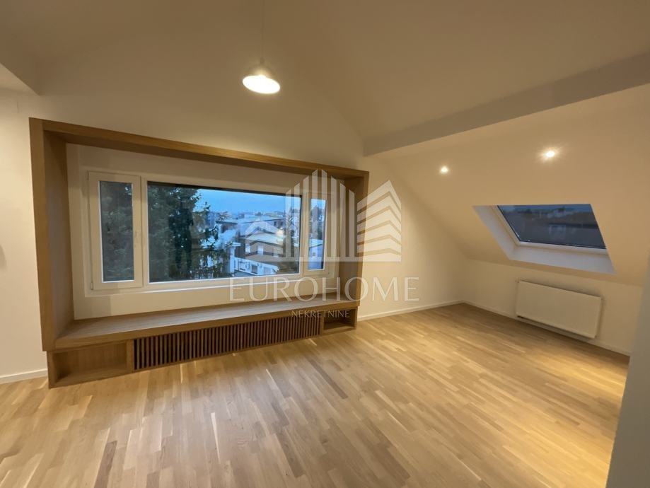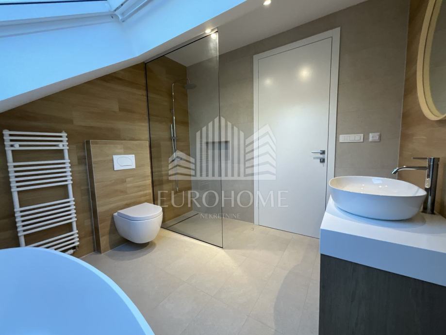 U maloj zgradi s četiri stana prodaje se vrhunski uređen trosobni stan u potkrovlju tlocrtne površine 74,07m2 i 5,12m2 galerije. Visina potkrovlja 4,5 m.