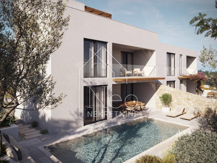 Nekretnina se prostire na tri etaže i odlikuje elegantnim dizajnom te vrhunskom opremom. Na vanjskom dijelu se nalazi privatni bazen sa sunčalištem dok će krovna terasa pružati nezaboravne zalaske sunca i potpuni osjećaj privatnosti.