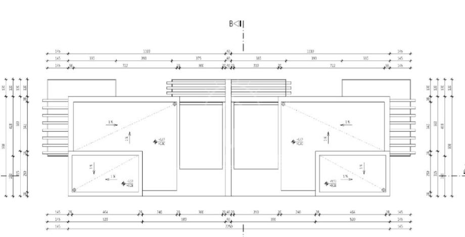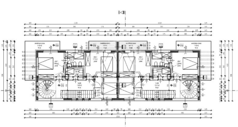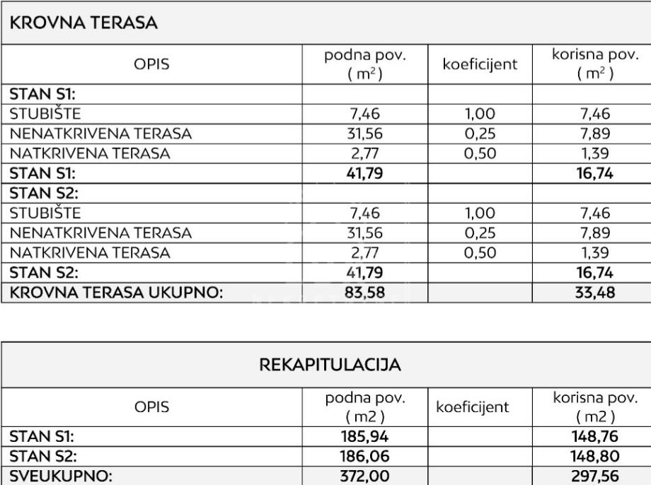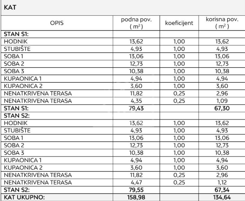 Sastoji se od prizemlja i kata. Prizemlje sadrži: hodnik (pov. 14.33 m2), dnevni boravak s kuhinjom i blagovaonicom (pov. 30.77 m2), spavaću sobu (pov. 12,17 m2) i kupaonicu (pov. 7.45 m2). Unutrašnjim stubištem dolazi se na 1. kat koji sadrži: hodnik (pov. 13.62 m2), tri spavaće sobe (pov. 10.38 m2, 12.73 m2 i 13.06 m2), dvije kupaonice (pov. 4.94 m2 i 3.60 m2), te dvije nenatkrivene terase (pov. 11.82 m2 i 4.47 m2). Jedna spavaća soba ima svoju kupaonicu. Spiralnim unutrašnjim stubištem dolazi se na krovnu terasu koja sadrži: nenatkrivenu terasu (pov. 31.56 m2) i natkrivenu terasu (pov. 2.77 m2). Na krovnoj terasi nalazit će se bazan koji će biti uređen i pripremljen za uporabu (s grijanjem) dimenzija 450 x 300 cm.