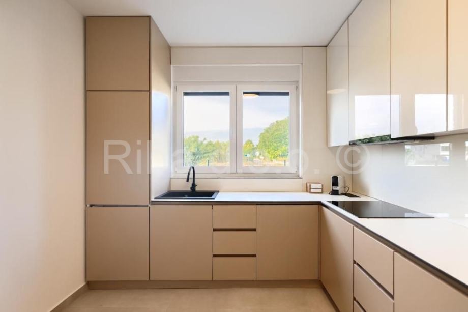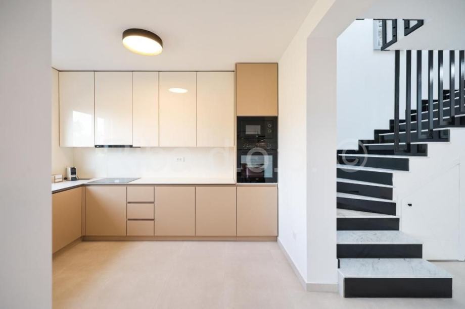 Ulaskom u vilu dolazi se u elegantan predprostor koji vodi prema prostranom dnevnom boravku otvorenog koncepta s blagovaonicom i modernom kuhinjom. Velike staklene stijene osiguravaju obilje prirodnog svjetla te omogućuju izravan izlaz na natkrivenu terasu i sunčalište uz bazen.