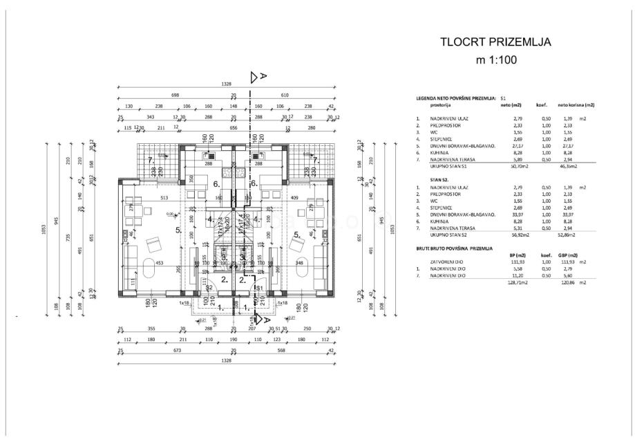 Neto korisna površina prizemlja iznosi približno 46–53m² po stanu (ovisno o jedinici).