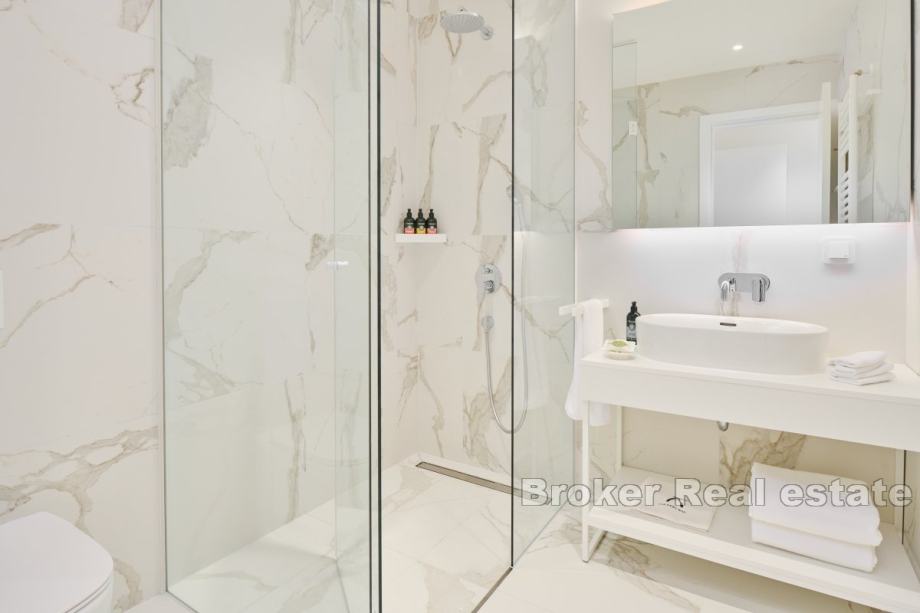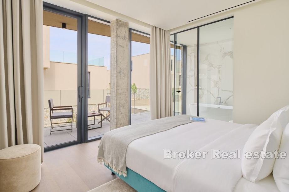 Prizemlje nekretnine, sastoji se od ulaznog hodnika koji vodi do tri predivne spavaće sobe svaka s vlastitim kupatilom, praonice i tehničke sobe. Također iz dvije spavaće sobe, izlazi se na balkon. Prvi kat ove vile osiguran je za spavaću sobu kojoj pripada kupatilo, te otvoreni prostor gdje se nalaze kuhinja, blagovaonica i dnevni prostor, te dodatni toalet. Drugi kat, također, zadnji kat vile osiguran za uživanje. Na zadnjem katu vile nalazi se toalet te je terasa jednim dijelom natkrivena, te se na istoj, nalazi i prostrani bazen s pogledom na more. Sve vile imaju besprijekorno korištenje usluga resorta.