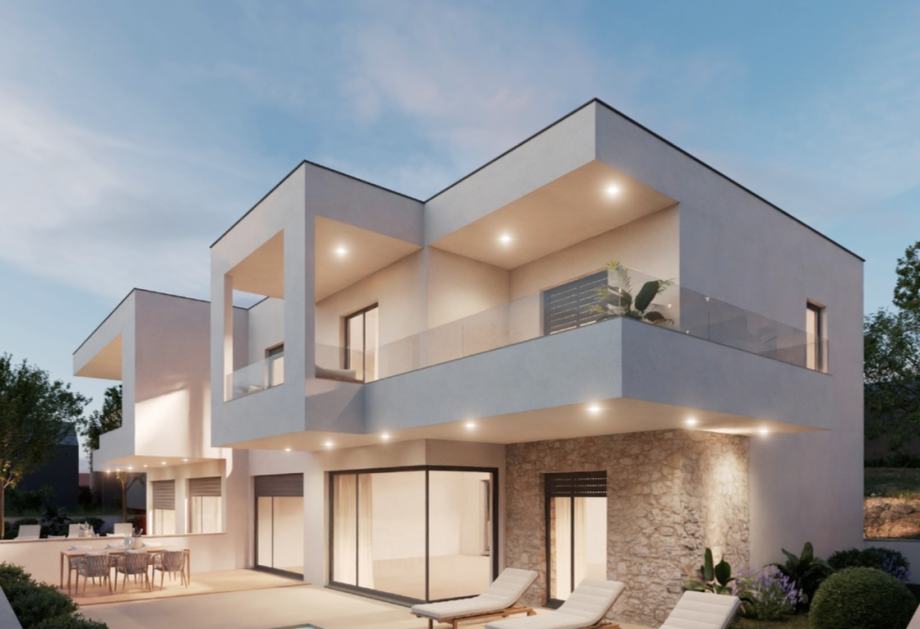 Prostirući se na 166,25 m² kroz dva pažljivo dizajnirana kata, ova dvojna kuća predstavlja vrhunac moderne sofisticiranosti i primorske spokojnosti.