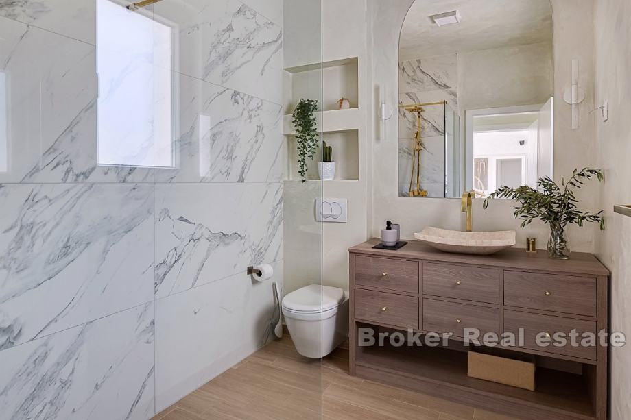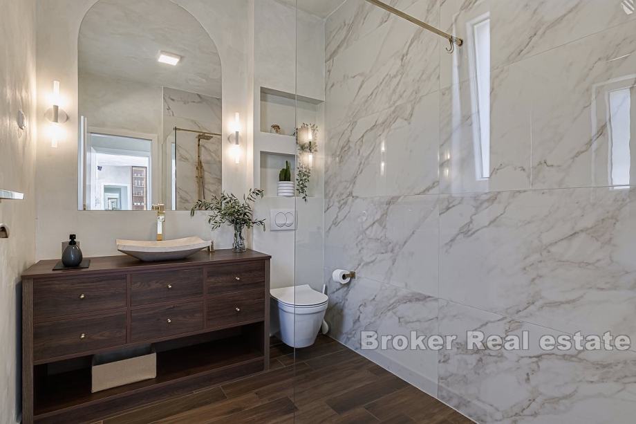 Kuća obuhvaća 104 m² pažljivo uređenog interijera, s luksuznim i pomno biranim namještajem. Uključuje dvije spavaće sobe s privatnim kupaonicama, dodatnu odvojenu kupaonicu, te otvoreni i prostrani dnevni boravak s blagovaonicom i vrhunskom potpuno opremljenom kuhinjom. Velike staklene stijenke omogućuju izlaz na prostranu terasu koja odiše elegancijom i pruža besprijekoran pogled na okoliš.