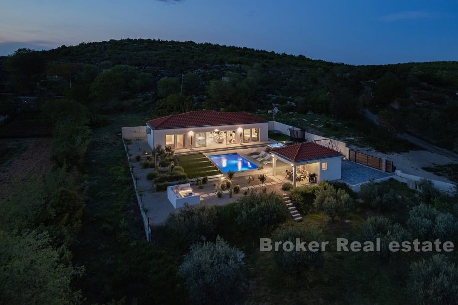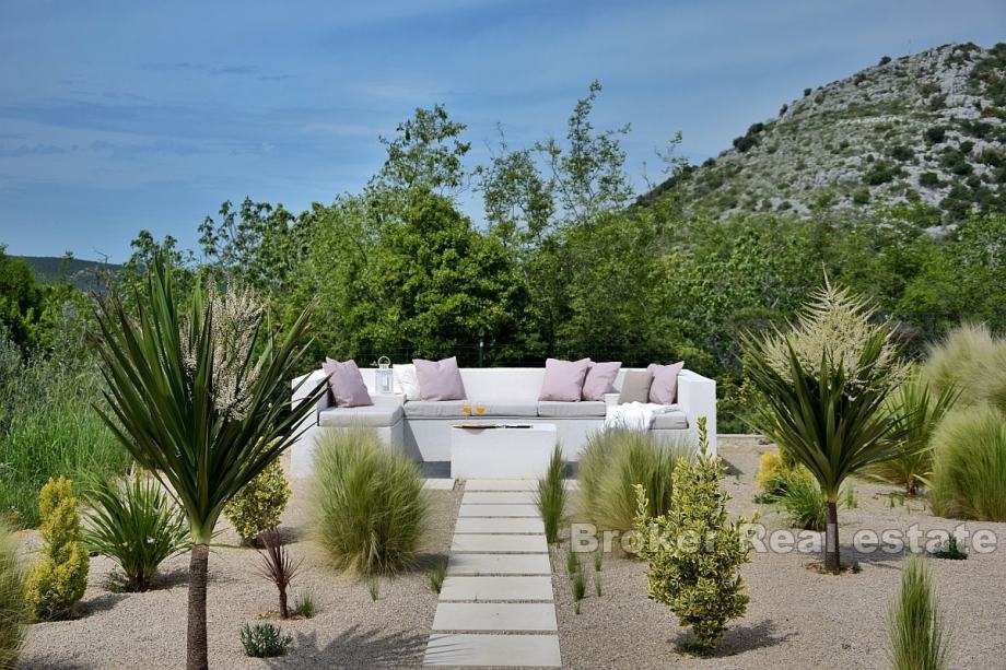 Kuća se savršeno uklapa u okruženje Dalmatinske zagore, koja pruža potpunu privatnost, mir i spokoj. Moderni interijer odražava sofisticirani dizajn koji se skladno stapa s prirodnim ljepotama, stvarajući dojam jedinstvene harmonije.