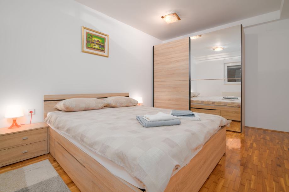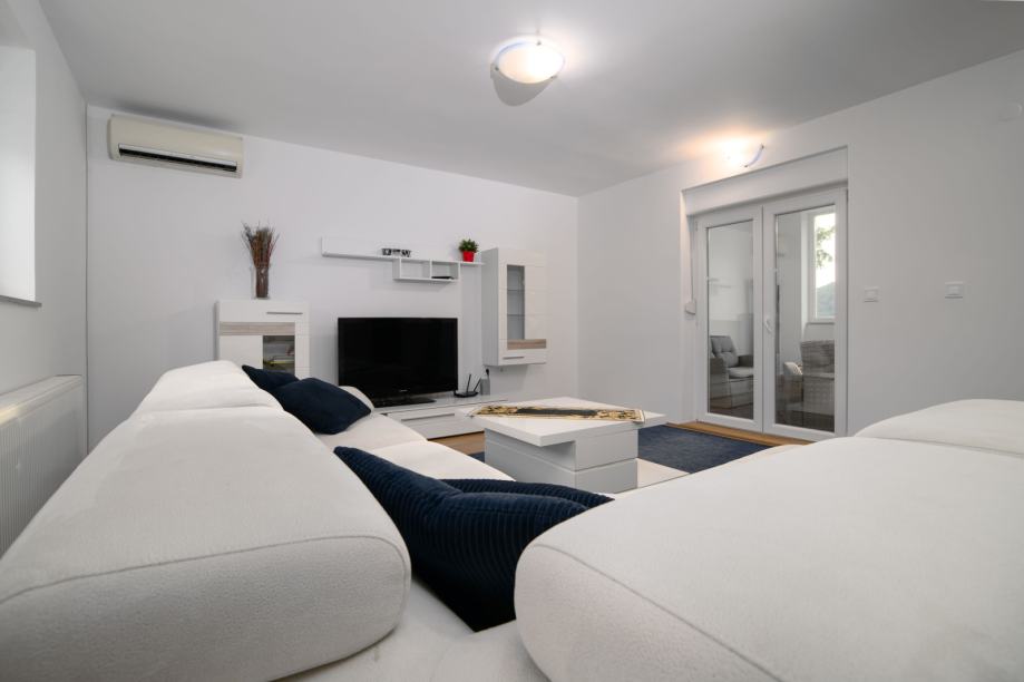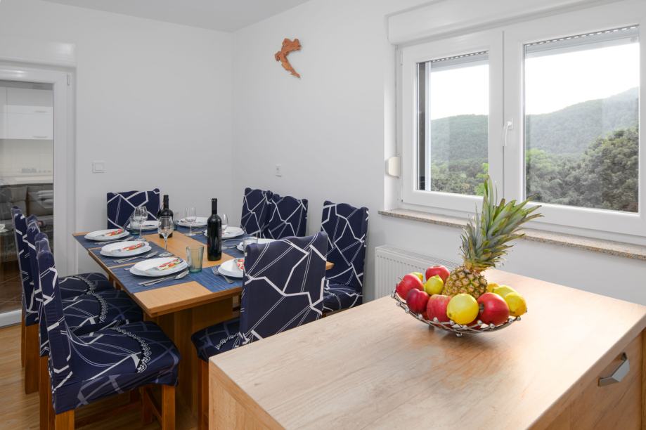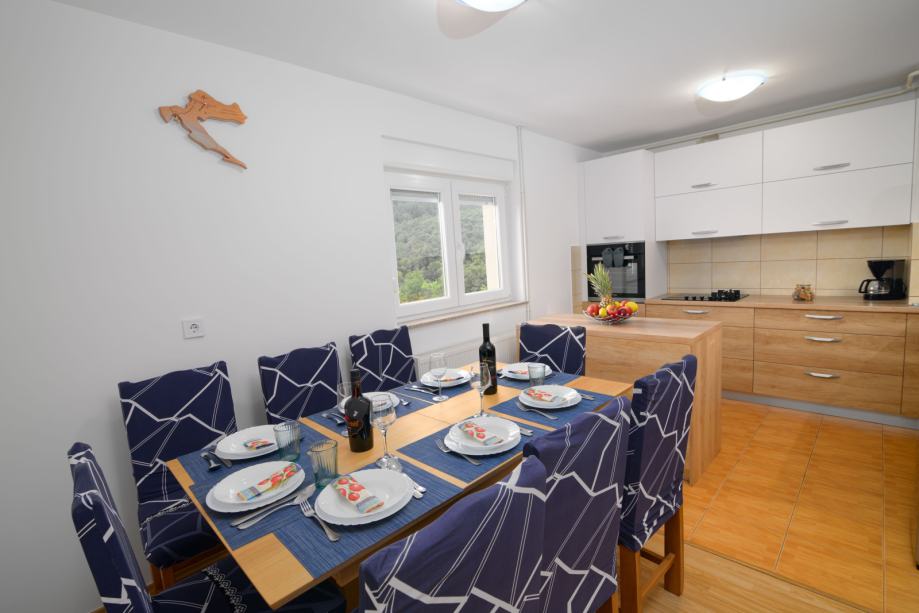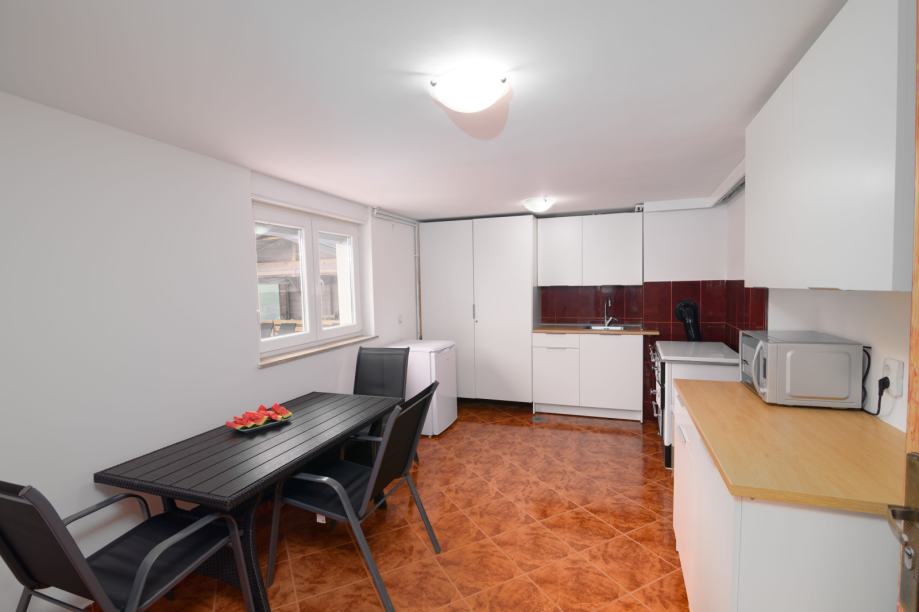 Prva etaža: elegantan ulazni hodnik, open space dnevni boravak s kaminom, moderna kuhinja, blagovaonica, zatvoreni balkon, jedna spavaća soba, kupaonica s WC-om te povezana garaža.