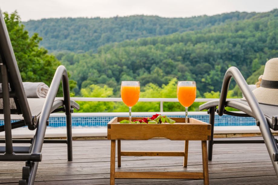 Lower floor: heated pool, jacuzzi, deck chairs, summer kitchen – all with breathtaking views and the relaxing sounds of nature.