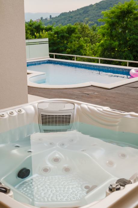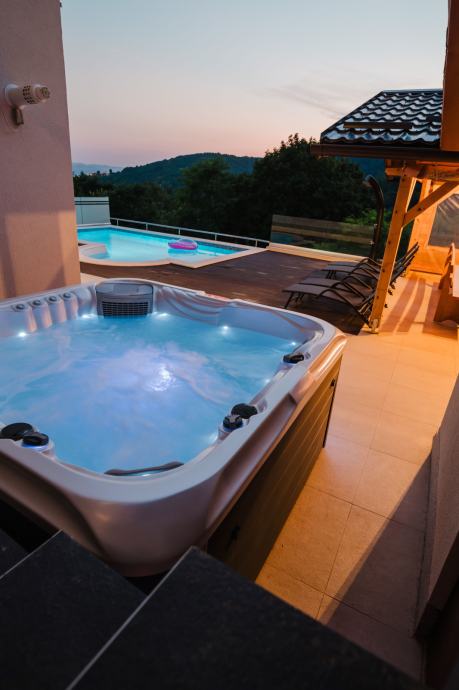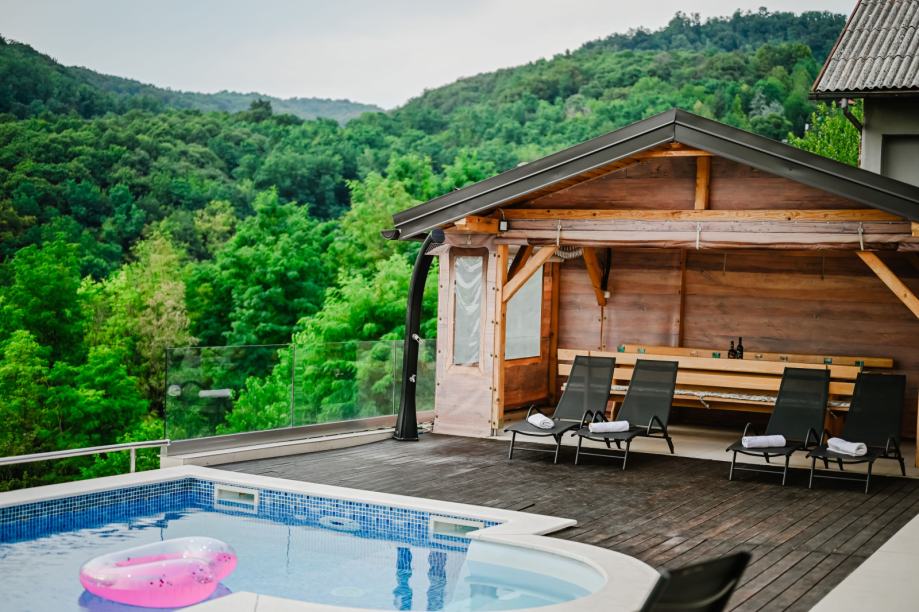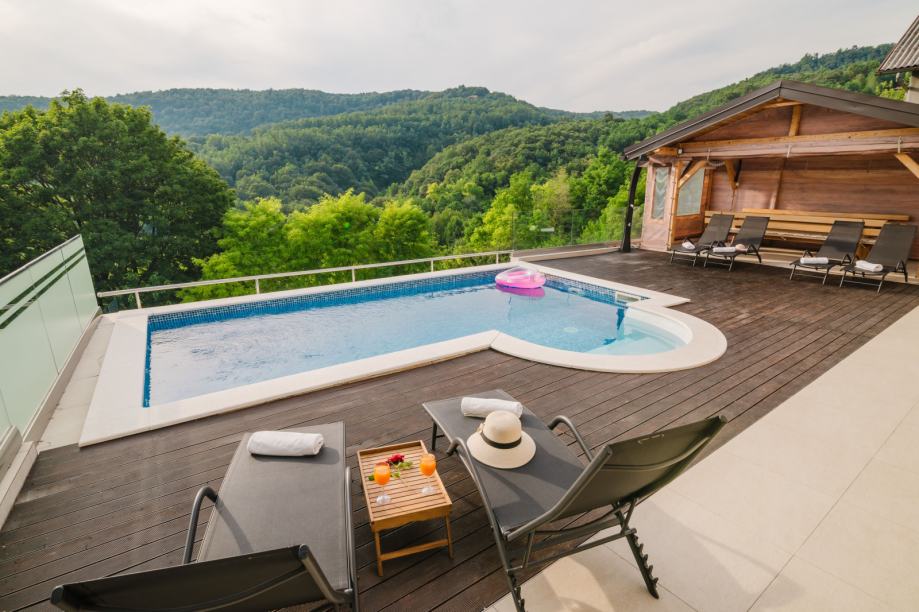 Donja etaža: grijani bazen, jacuzzi, ležaljke, ljetna kuhinja – sve s pogledom koji oduzima dah i uz opuštajući zvuk prirode.