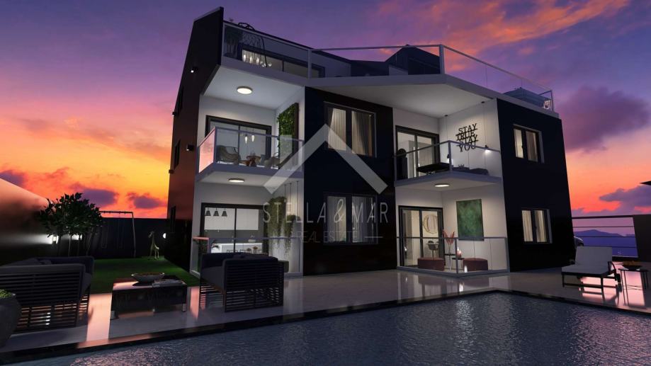 Na drugom katu se nalazi prekrasan Penthouse površine 106m2, raspolaže sa dnevnim boravkom, kuhinjom, blagovaonom, tri spavaće sobe, dvije kupaone i prekrasnu terasu sa koje se pruža panoramsku pogled na more.