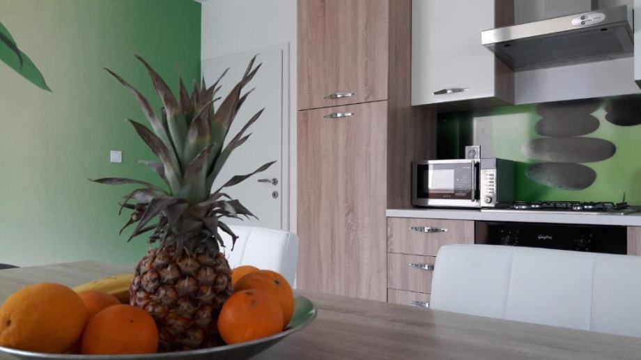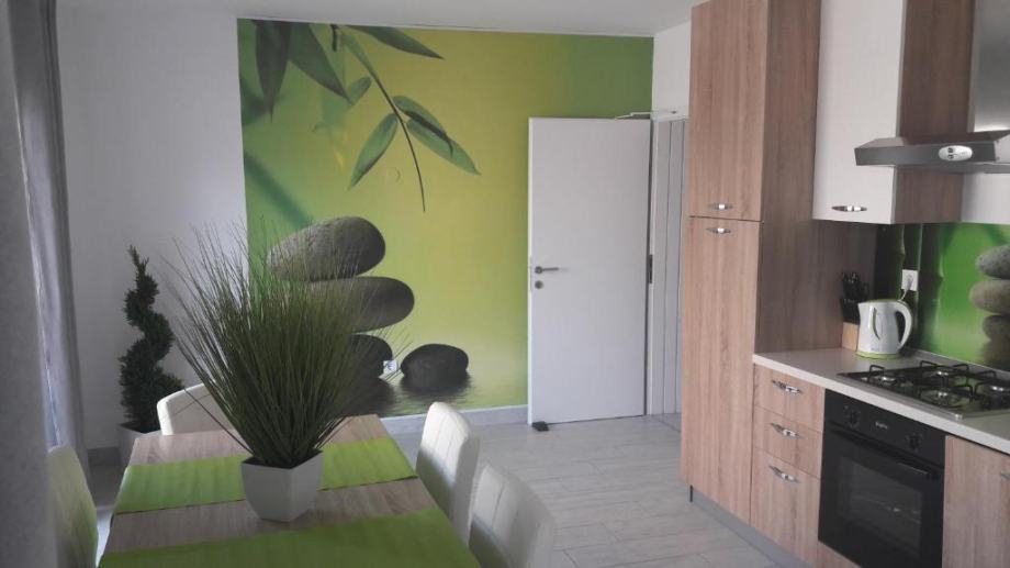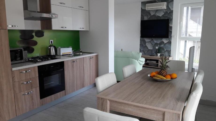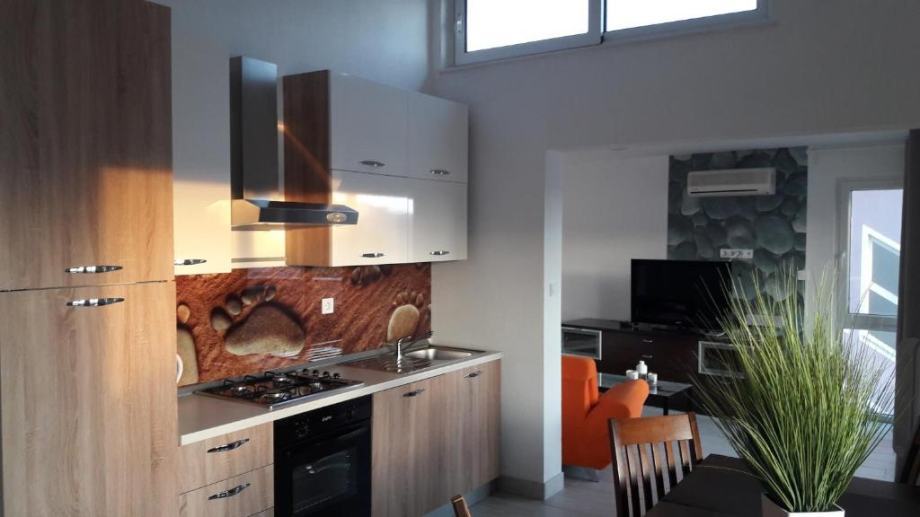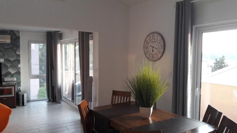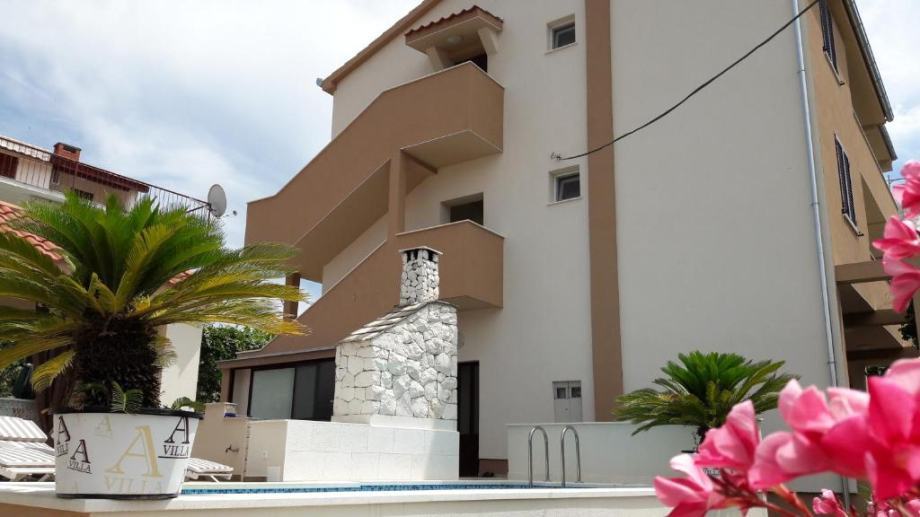 Prodaje se luksuzna kuća u Okrugu Gornjem. Kuća se prostire na 3 etaže sa ukupno 300 m2 stambenog prostora. Na svakoj etaži se nalazi stan od 100 m2 sa dvije spavaće sobe sa vlastitim kupaonicama, dnevnim boravkom, kuhinjom i blagovaonicom, dodatnom kupaonicom i terasom ili balkonom. Podno grijanje je postavljeno u svim prostorijama na sve tri etaže objekta. Ispred kuće je izgrađena vanjska natkrivena blagovaonica sa kuhinjom ispred koje se nalazi grijani bazen sa masažnim mlaznicama. U sunčalište oko bazena je također ugrađeno podno grijanje kako bi korištenje bazena i sunčališta bilo ugodno i po hladnijim danima. Ispod bazena se nalazi prostor koji služi kao fitness centar i teretana. Kuća je obnovljena potpuno prije nekoliko godina. Objekt se koristi u turističke svrhe.