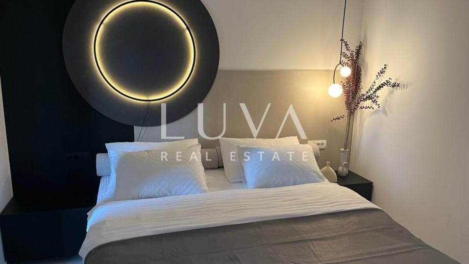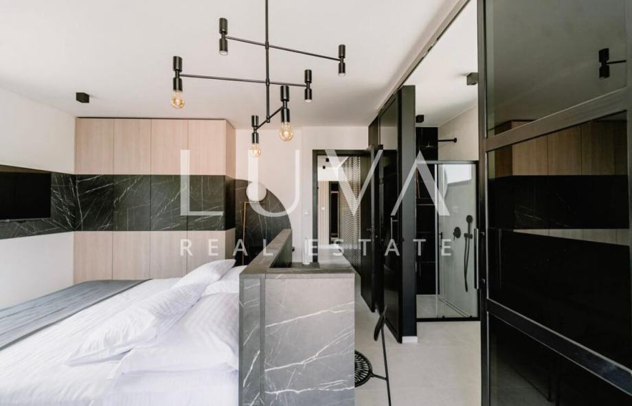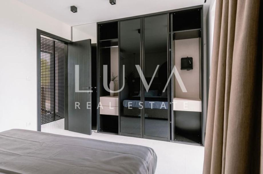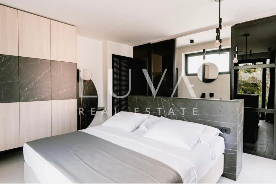 U prizemlju se nalazi potpuno opremljena moderna kuhinja na koju se nastavlja dnevni boravak, a okruženi su velikim staklenim stijenama kroz koje se izlazi na vanjski dio gdje se nalazi bazen. Ova luksuzna kuća ima 4 spavaće sobe s vlastitim kupaonicama, a osim toga ima i saunu.