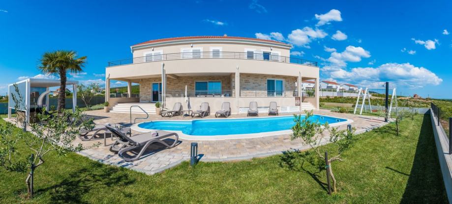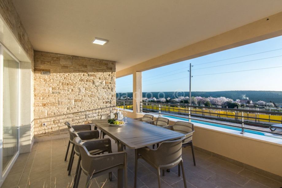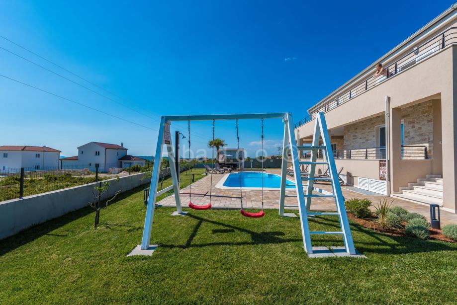 Kuću okružuje veliki i lijepo uređeni vrt sa velikim travnjakom i puno mediteranskih biljaka. U vrtu je i bazen s grijanom vodom pokraj kojeg se nalazi mala natkrivena sjenica.