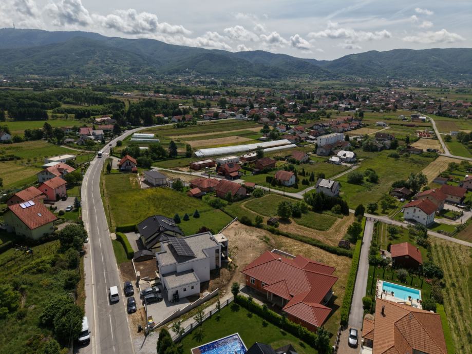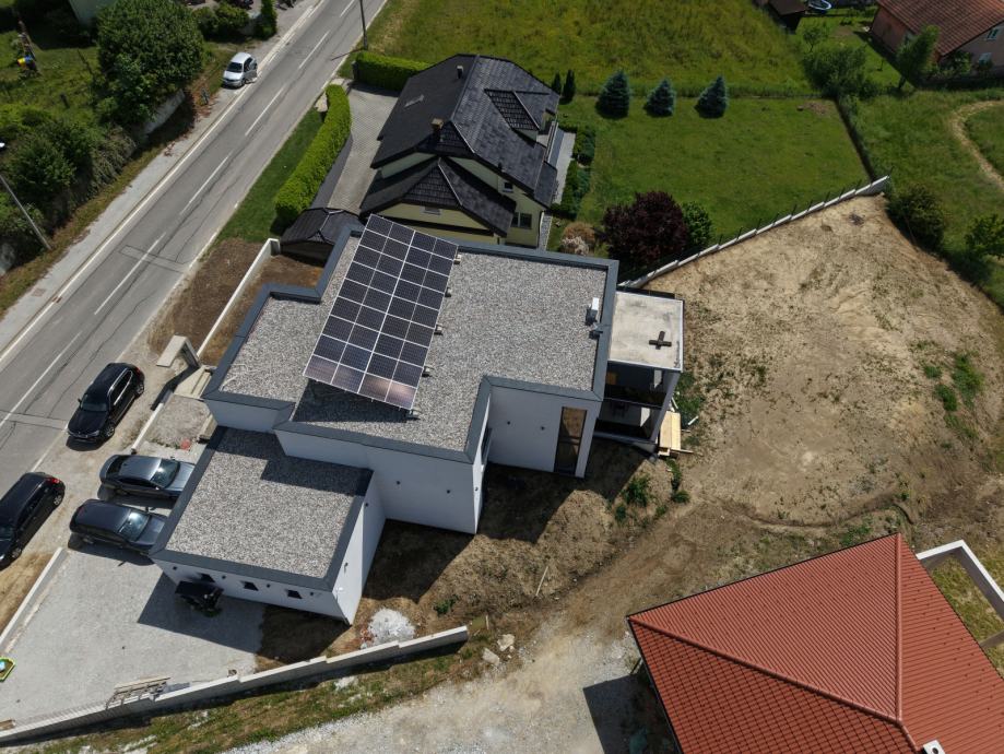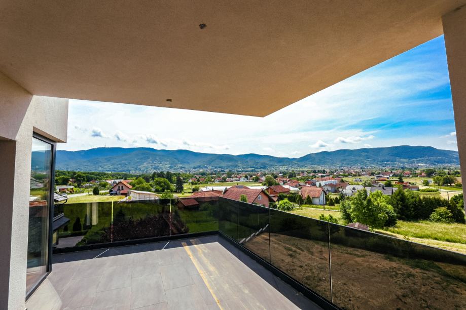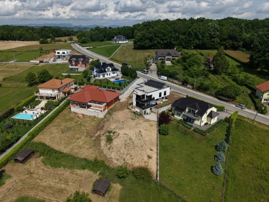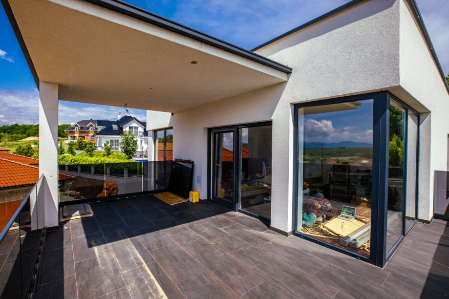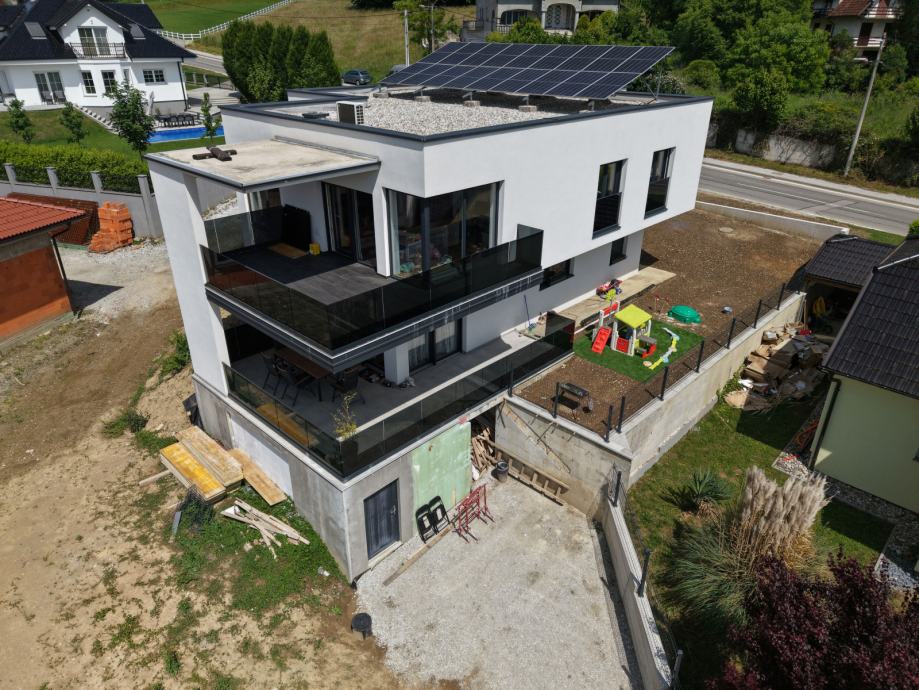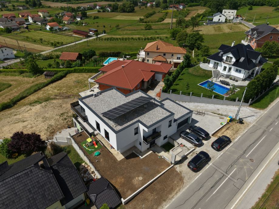 Fasada kuće je estetski privlačna s ravnim krovom koji prati modernistički arhitektonski stil, a kuhinja s blagovaonicom pruža funkcionalnost i eleganciju. Ova kuća nudi sve što vam je potrebno za luksuzno življenje u blizini Zagreba, a njezina orijentacija prema istoku, jugu, sjeveru i zapadu omogućuje maksimalno iskorištavanje prirodne svjetlosti.