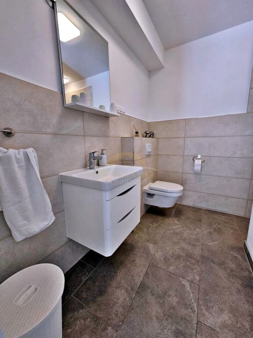 U prizemlju kuće nalazi se prostrani stan sa četiri sobe, veliki dnevni boravak sa vrhunskom opremljenom kuhinjom, kupaonica i wc. Iz dnevnog boravka izlazi se na veliku terasu koja ima prekrasan otvoren pogled na more.