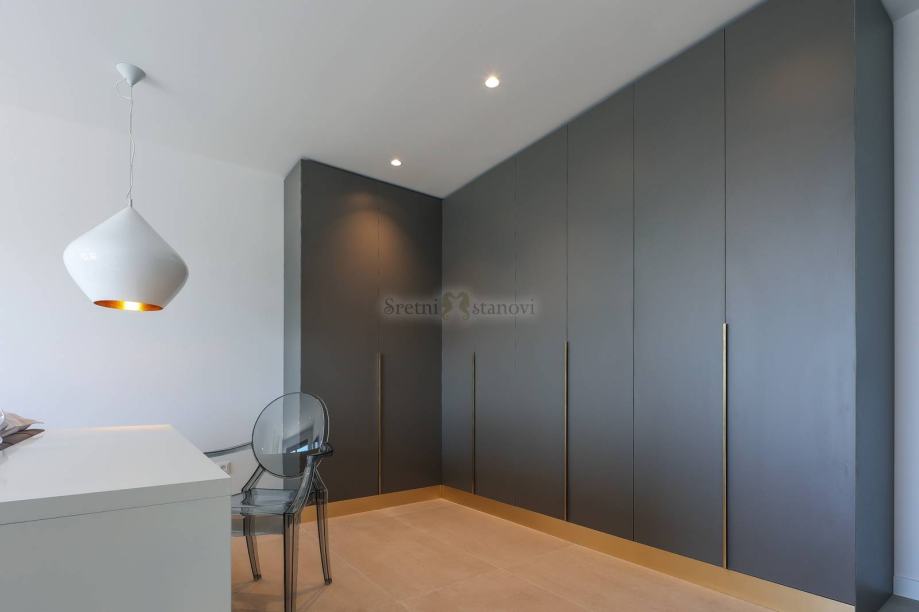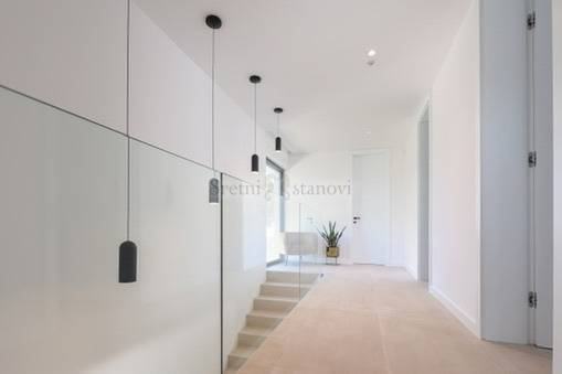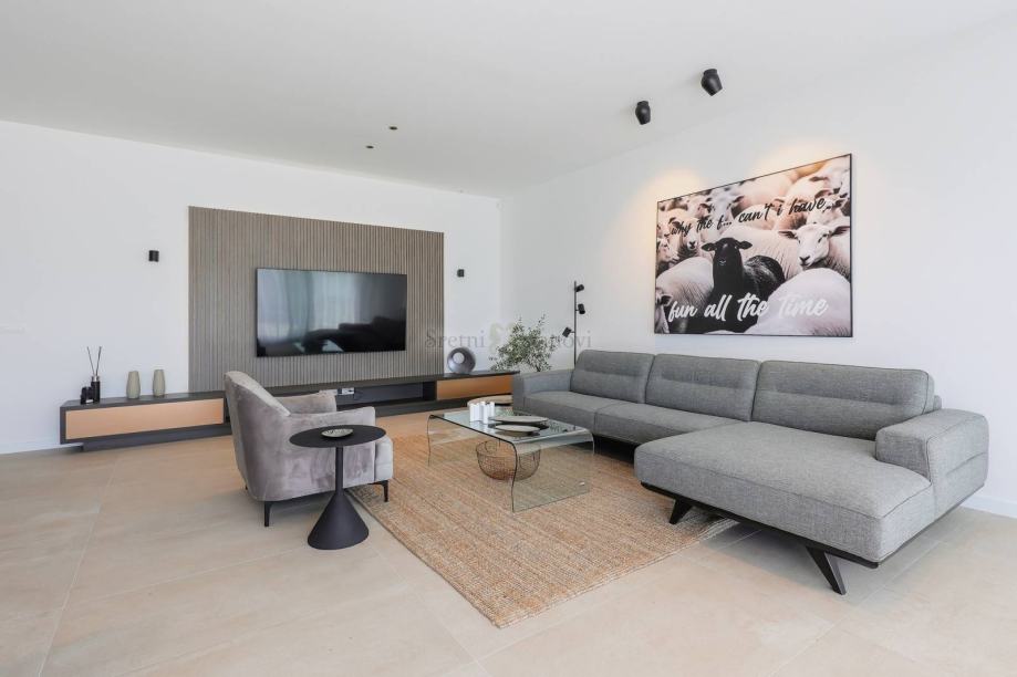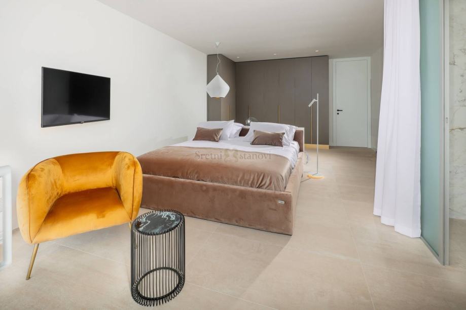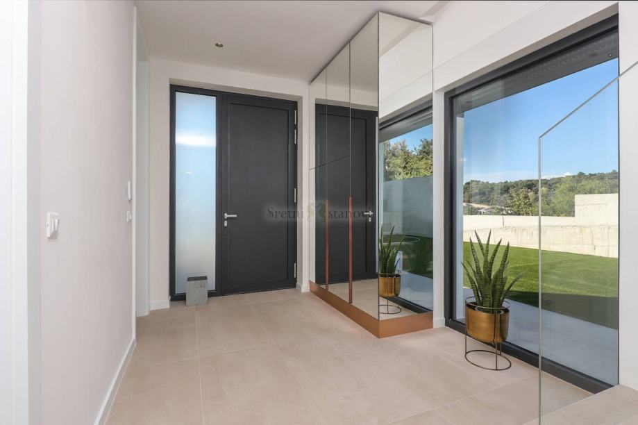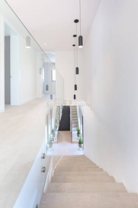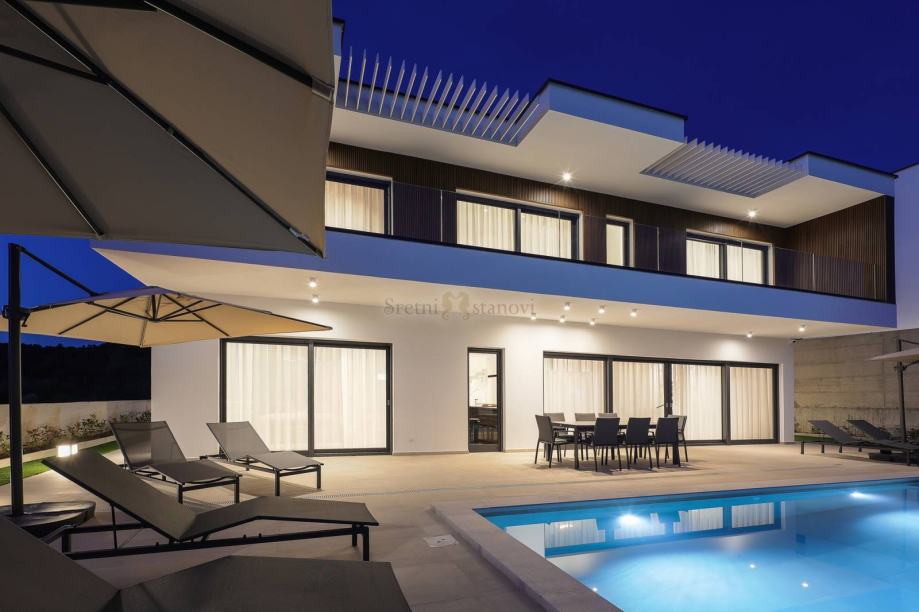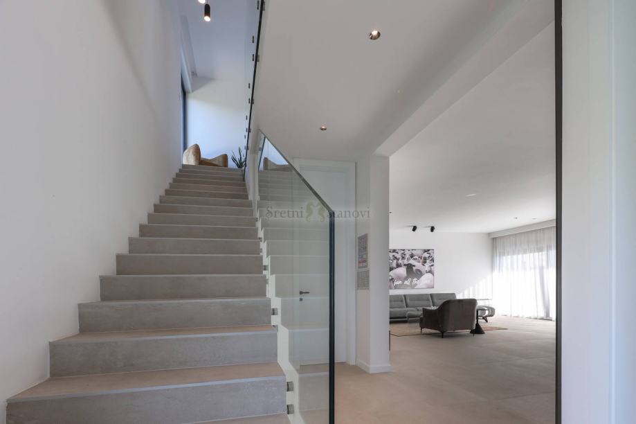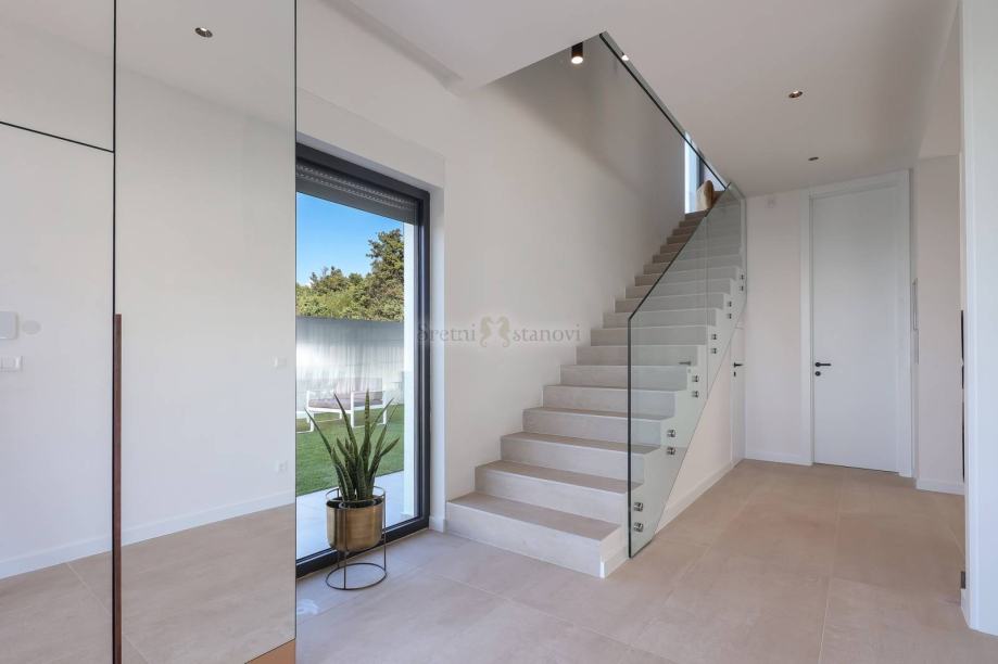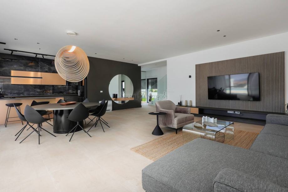 Prizemlje kuće se sastoji od dnevnog boravka, blagovaonice i kuhinje, spavaće sobe s kupaonom, gostinjske kupaone, teretane s saunom i ostave, a iz dnevnog se boravka izlazi na prekrasnu terasu s bazenom i uređenim okolišem, travnjak s vanjskim kaminom/roštilj zonom. U okućnici, ispod terase, je također i već navedeni apartman s kupaonom i spavaćom sobom (poseban ulaz). Na prvom katu su smještene tri spavaće sobe s vlastitim kupaonicama, degažman, vešeraj, dva balkona te jedna loggia. Sva bazenska oprema je prvoklasna sa toplinskom pumpom i strojarnicom, a bazen koisti ekološki i ekonomičan susatav pročišćavanja - elektroliza solju).
