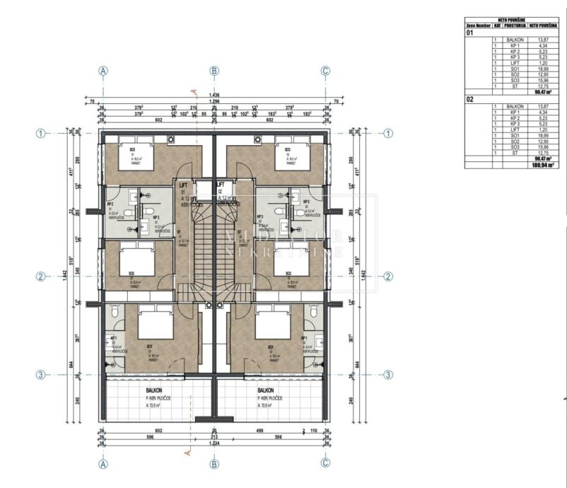 Kat ima 90,47 m2 te se na njemu nalaze hodnik, kupaona, jedna spavaća soba, druga spavaća soba sa svojom kupaonom, te treća spavaća soba sa svojom kupaonom i izlazom na balkon s prekrasnim pogledom.