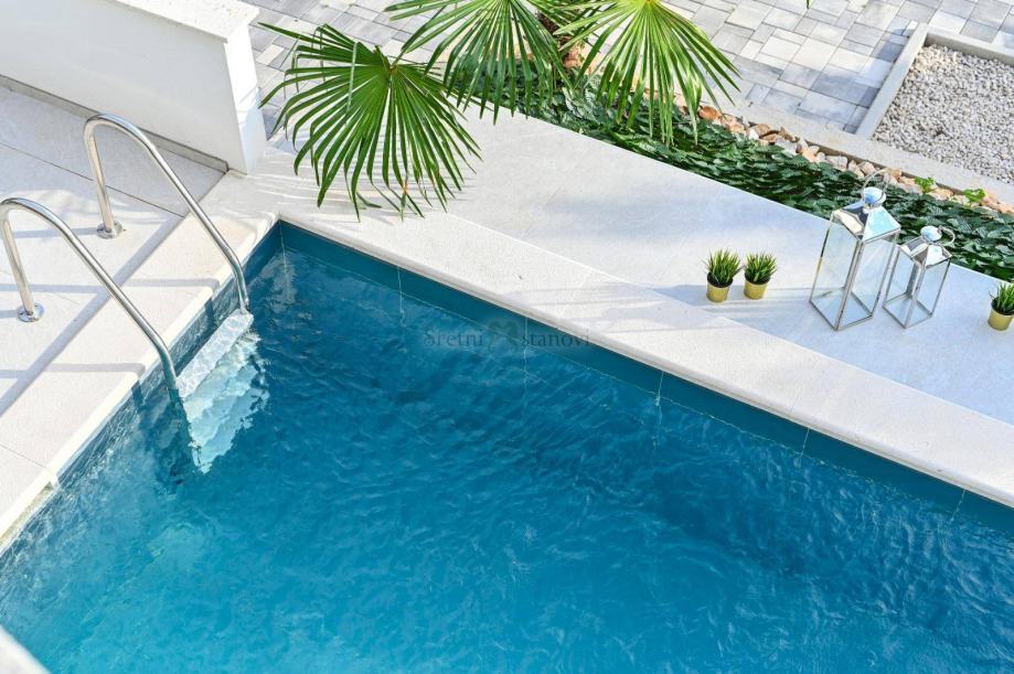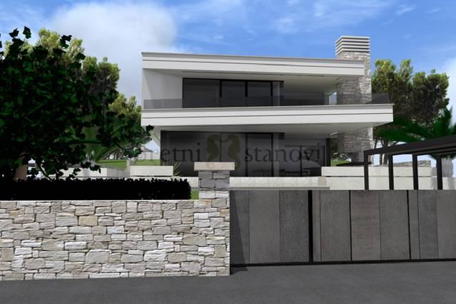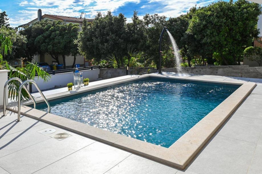 Luksuzna kuća, novogradnja, na otoku Pagu koja se nalazi u mirnom mjestu Mandre, udaljena od mora svega 250 m. Sastoji se od 4 spavaće sobe, 4 kupaone, kuhinje, dnevnog boravka, blagavaone, gostinjskog wc-a, garderobe, spremišta, hodnika i terasa. U okućnici kuće se nalazi bazen te parking za 2 vozila. Kuća je završena i spremna za useljenje. Čisto vlasništvo i uredni papiri gradnje.