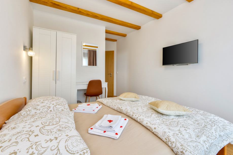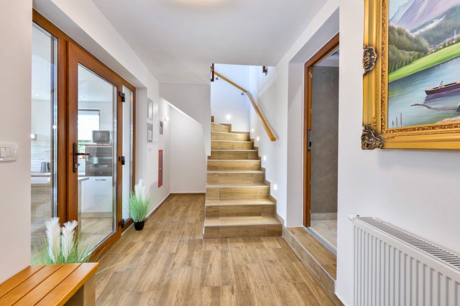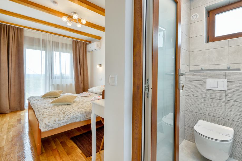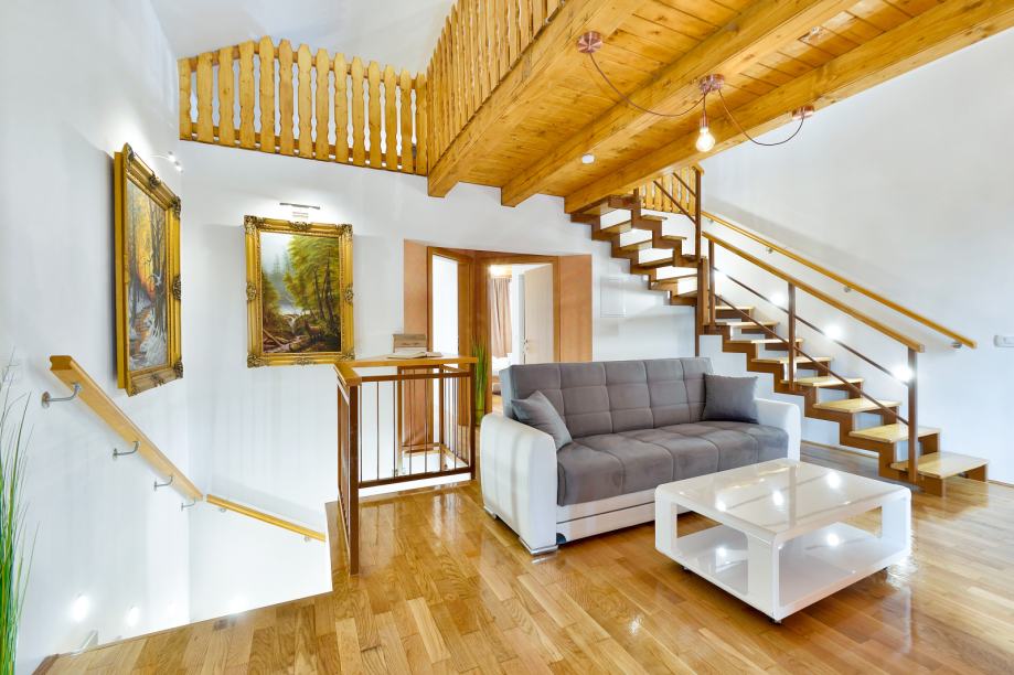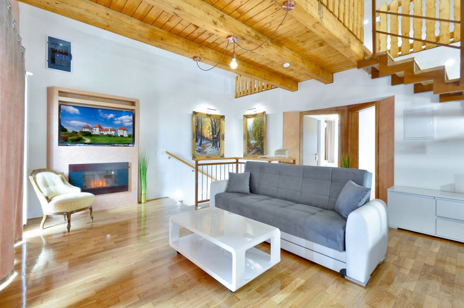 Na katu je veliki dnevni boravak sa balkonom, dvije spavaće sobe s balkonima, te svaka sa svojom kupaonicom.