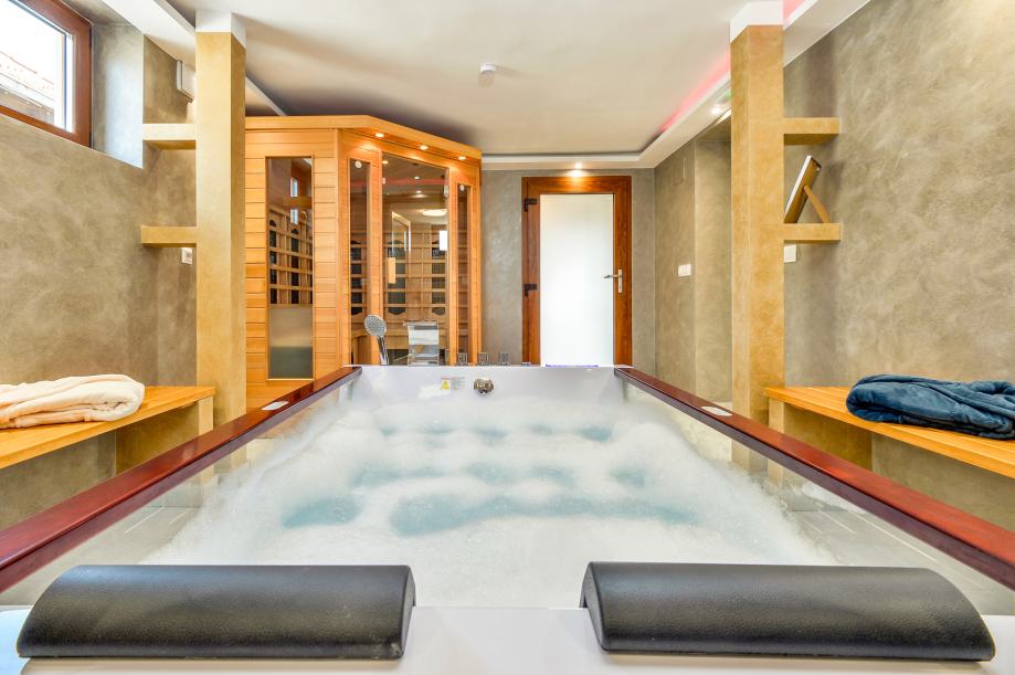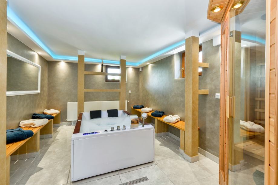 U prizemlju kuće smješteni su kuhinja i blagovanica, terasa (sjenica), kupaonica, soba za opuštanje s jacuzziem i saunom, te kotlovnica.