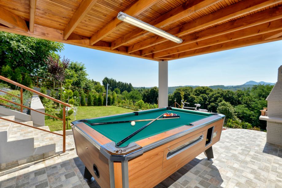 U dvorištu posjeda smještena je dvostruka sjenica ispred kuće na koju će može izaći iz prizemlja, a donja kaskada ulazi ispod sjenice gdje se nalaze kamin, biljar i vanjski prostor za druženja.