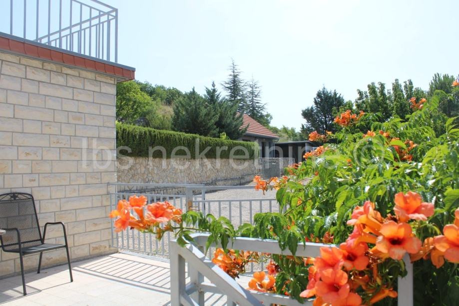 U razini prizemlja se nalazi velika djelimično natkrivena terasa ukupne površine preko 60m2 s prekrasnim pogledom na Sinjsko polje , okolna brda i planine Mosor i Svilaju, jednom riječju, savršeno.