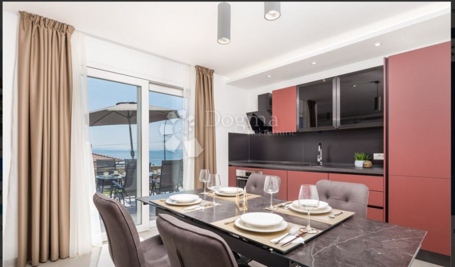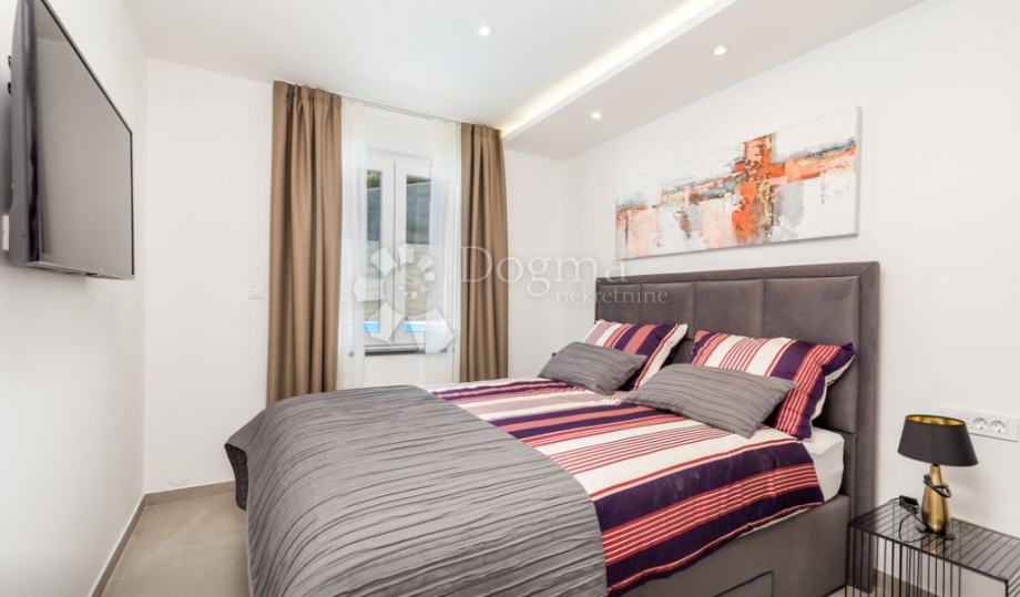 Okružena kultiviranom okućnicom s brižljivo uzgojenim travnjakom, vrtnom garniturom, suncobranom i sunčalištem, pruža vam mogućnost da se opustite i uživate na otvorenom. Bazen će vam pružiti osvježenje tijekom vrućih ljetnih dana, dok ćete s terase moći promatrati zalazak sunca nad beskrajnim plavetnilom mora.